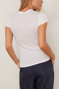 The Dorothee Schumacher Chic Comfort Shirt will go with just about everything in your wardrobe. This t-shirt is crafted in a lightweight stretch cashmere blend with a slim silhouette. Wear yours with a skirt and sandals. FIT DESCRIPTION MODEL MEASUREMENTS - Fits true to size, take your normal size - T-shirt - Slim silhouette - Crew neckline - Ribbed trim - 86 % Modal, 10 % Cashmere, 4 % Elastane - Charley is wearing a size 1/ XS - Bust: 33” - Waist: 25” - Hips: 34” - Height: 5’8”