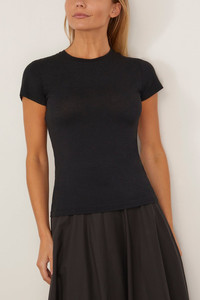 The Dorothee Schumacher Chic Comfort Shirt will go with just about everything in your wardrobe. This t-shirt is crafted in a lightweight stretch cashmere blend with a slim silhouette. Wear yours with a skirt and sandals. FIT DESCRIPTION MODEL MEASUREMENTS - Fits true to size, take your normal size - T-shirt - Slim silhouette - Crew neckline - Ribbed trim - 86 % Modal, 10 % Cashmere, 4 % Elastane - Charley is wearing a size 1/ XS - Bust: 33” - Waist: 25” - Hips: 34” - Height: 5’8”