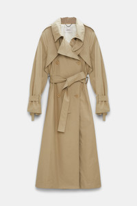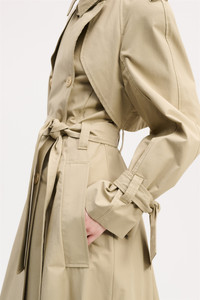 A forever favorite outerwear style, the classic trench coat gets a modern remake: Reimagined in techno fabric and cut with a slight A-line silhouette, it's every bit as feminine as it is iconic. Material & Care - 59 % Cotton, 41 % Polyamide - Double-breasted trench coat in techno fabric - Wide collar with removable throat latch - Raglan long sleeves with draped storm flap on the front and back - Epaulettes - Tie belt on the cuffs - Self-tie sash - Belt loops with button detail at the back - Welted side pockets - Inverted back pleat Size & Fit - Our model is 177cm tall and wears a size S - Loosely tailored - Slight A-line flare from the waist to hem