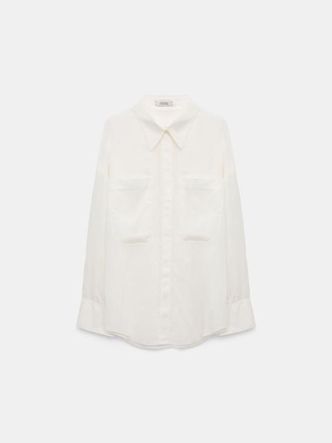 The shirt is made from silk-viscose and has an oversized silhouette. The shirt has a classic collar and patch pockets. Material & Care - 84 % Viscose, 16 % Silk - Oversized shirt in striped silk-viscose - Classic collar - Patch pockets - Hidden button placket - WE CARE - Fabric supplier produces according to 4sustainability Size & Fit - Our model is 179 cm tall and wears a size S - Oversized - Deep dropped shoulders