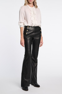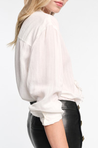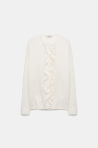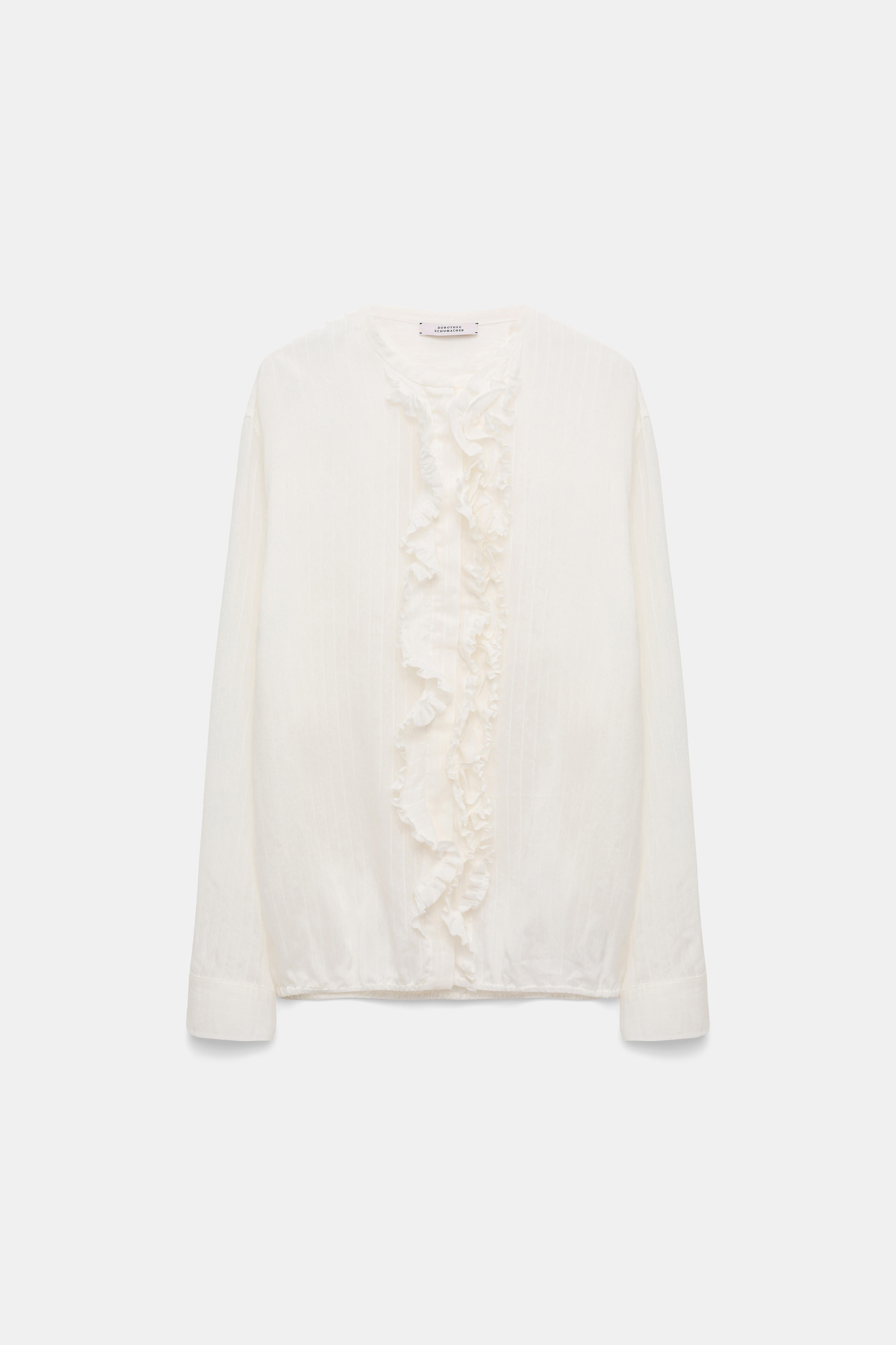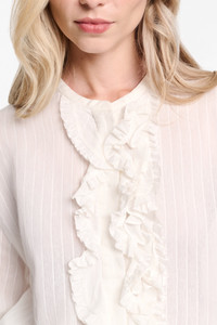 The blouse is made from silk-viscose and has asymmetric ruffle trim on the front. The blouse has a blouson-style elastic hemline. Material & Care - 84 % Viscose, 16 % Silk - Striped silk-viscose blouson-style blouse - Collarless - Hidden button placket with asymmetric ruffles - Elastic hemline - WE CARE - Fabric supplier produces according to 4sustainability Size & Fit - Our model is 179 cm tall and wears a size S - Relaxed fit - Dropped shoulders