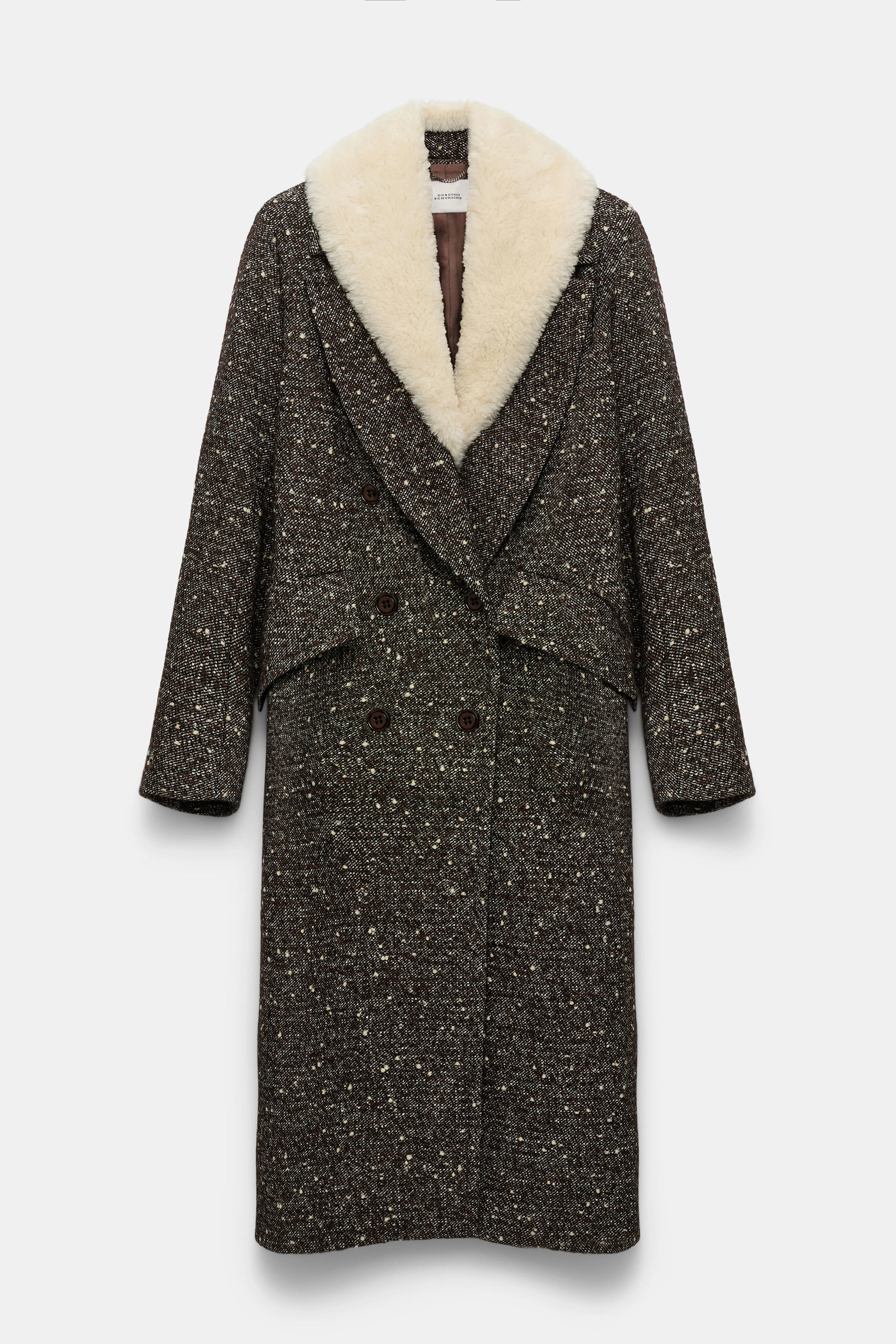The long coat is detailed in a wool tweed mix and features a removable faux fur collar. The coat is slightly oversized and has flap pockets. Material & Care - 42 % Wool, 29 % Polyacrylic, 20 % Polyester, 6 % Polyamide, 3 % Other Fibres - Wool-mix coat with removable faux fur collar - Notched lapel - Double-breasted - Flap pockets - Slit cuffs - Fully lined - Hand wash cold / Machine wash old - Wash with similar colors Size & Fit - Our model is 178cm tall and wears a size 2 - Slightly oversized