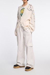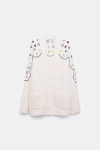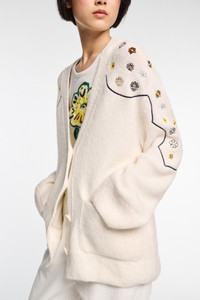 Flowers included with purchase: The V-neck cardigan is made from a fuzzy alpaca blend and has shoulders and wide long sleeves covered with embroidered flowers. Material & Care - 71 % Alpaca, 22 % Polyamide, 4 % Wool, 3 % Elastane - 72 % Alpaca, 22 % Polyamide, 4 % Wool, 2 % Elastane - Alpaca-blend cardigan - V-neckline - Shoulders and wide long sleeves with embroidered flowers - Patch pockets - Western-inspired embroidered border Size & Fit - Our model is 179 cm tall and wears a size S - Relaxed fit - Straight, wide sleeves - Slight dropped shoulders