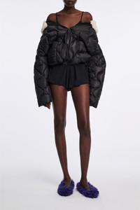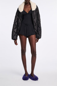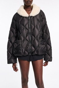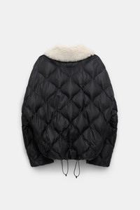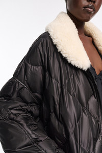 The quilted down jacket is slightly oversized and features a contrast shawl collar in faux fur. The cozy style has a zip front closure and drawstring waist pulls. Material & Care - 100 % Polyamide - Quilted down jacket with front zip closure - Contrast faux fur collar - Welt pockets - Patch pockets - Reinforced smooth patches on the sleeves - Drawstring hem Size & Fit - Slightly oversized