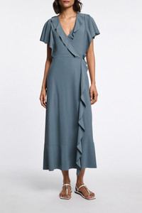 Life's a beach. Pack this dress: The long dress has a ruffle wrap front and draped ruffle short sleeves. The dress comes with a matching belt. Material & Care - 75 % Polyamide, 25 % Elastane - Wrap dress with ruffles - Raw edges on the ruffles - Bonded belt - WE CARE - This item is finished according to STANDARD 100 by OEKO-TEX, 22.0.98928 Hohenstein HTTI - Mild wash / Delicates - Wash with similar colors Size & Fit - Our model is 178cm tall and wears a size S - Loosely fitted