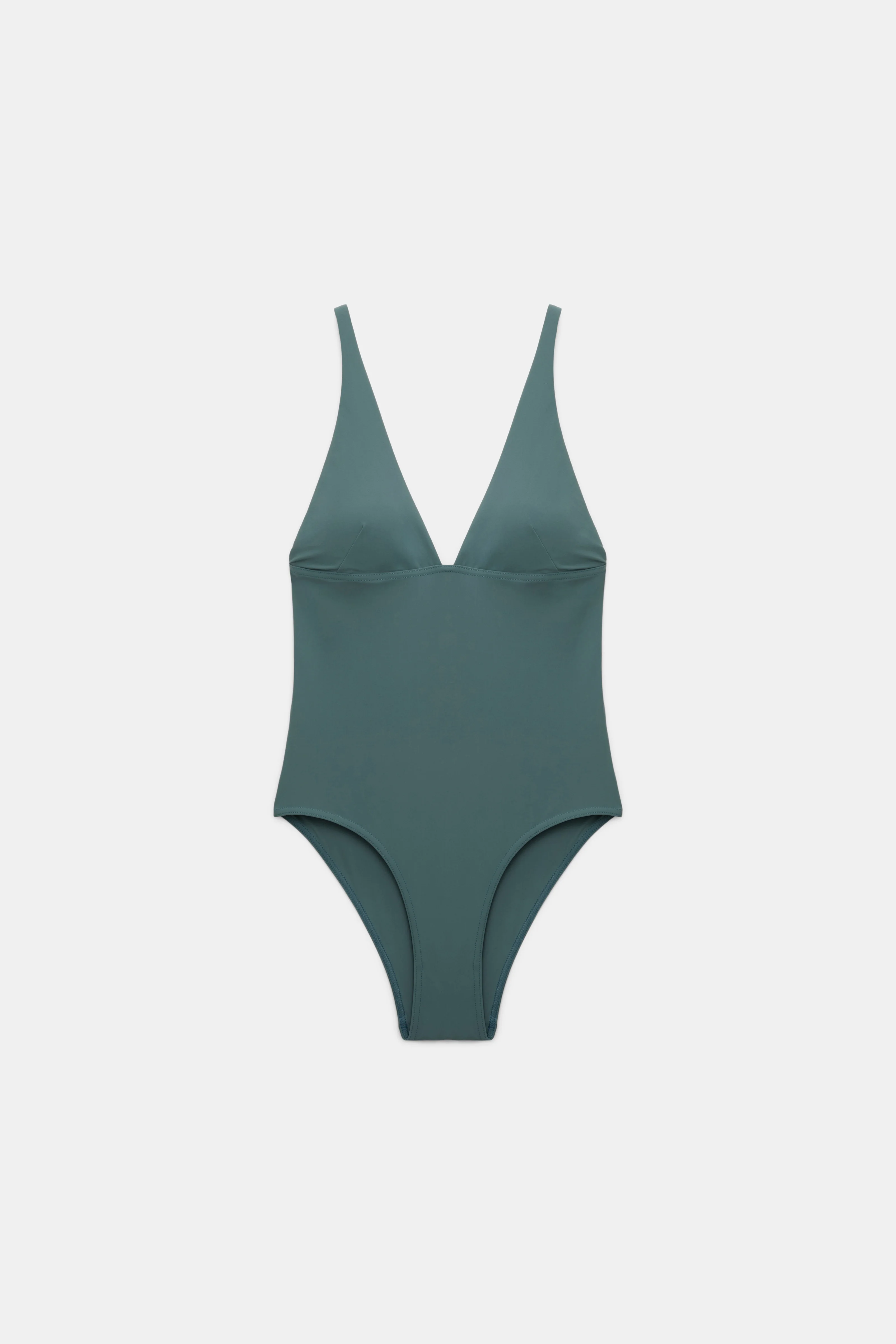 The V-neck swimsuit has adjustable straps and icy gold-tone stud detailing on the back. The swimsuit has removable padding. Material & Care - 75 % Polyamide, 25 % Elastane - V-neck swimsuit - Double layer body - Removable padding - Adjustable straps - Double-needle stitching on the leg opening - Icy gold-tone metal studs on the back - Mild wash / Delicates - Wash with similar colors Size & Fit - Our model is 178cm tall and wears a size S - Deep V-neckline - FITTED