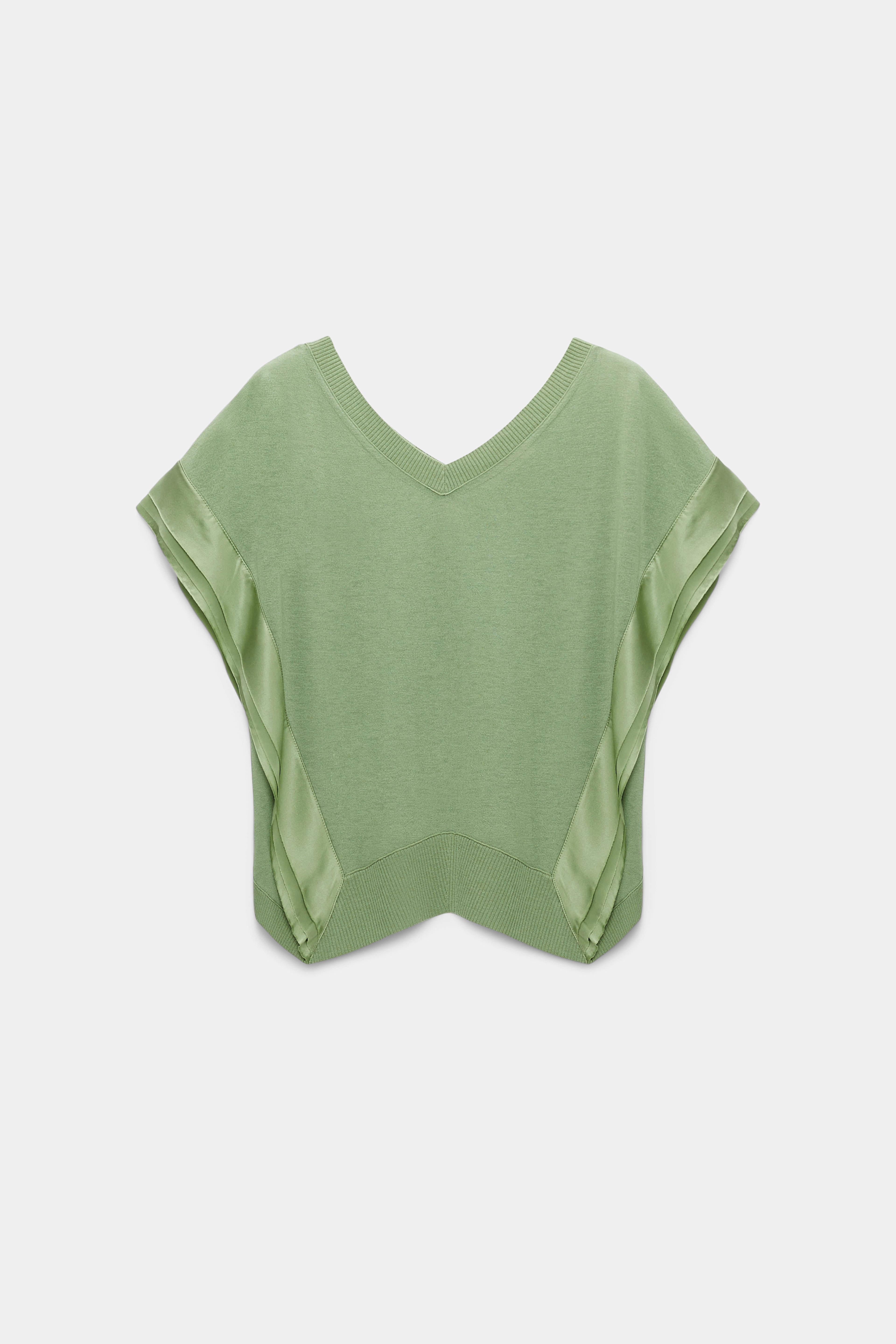 The knit top is crafted in a soft mix of Merino wool and cashmere, and has layered tonal satin trim. The short sleeve style drapes over the shoulders and has a V-neckline in the front and back. Material & Care - 70 % Virgin wool (Merino), 30 % Cashmere - Wool-cashmere knit top with layered satin trim - V-neckline in the front and the back - Tonal satin trim drapes diagonally on the front and back - Draped shoulders and short sleeves - Ribbed knit trim on the neckline and zig-zag shaped hemline - WE CARE - The yarn used is mulesing-free - Hand wash program cold / Machine wash cold - Wash with similar colors Size & Fit - Generous fit - Dropped shoulders