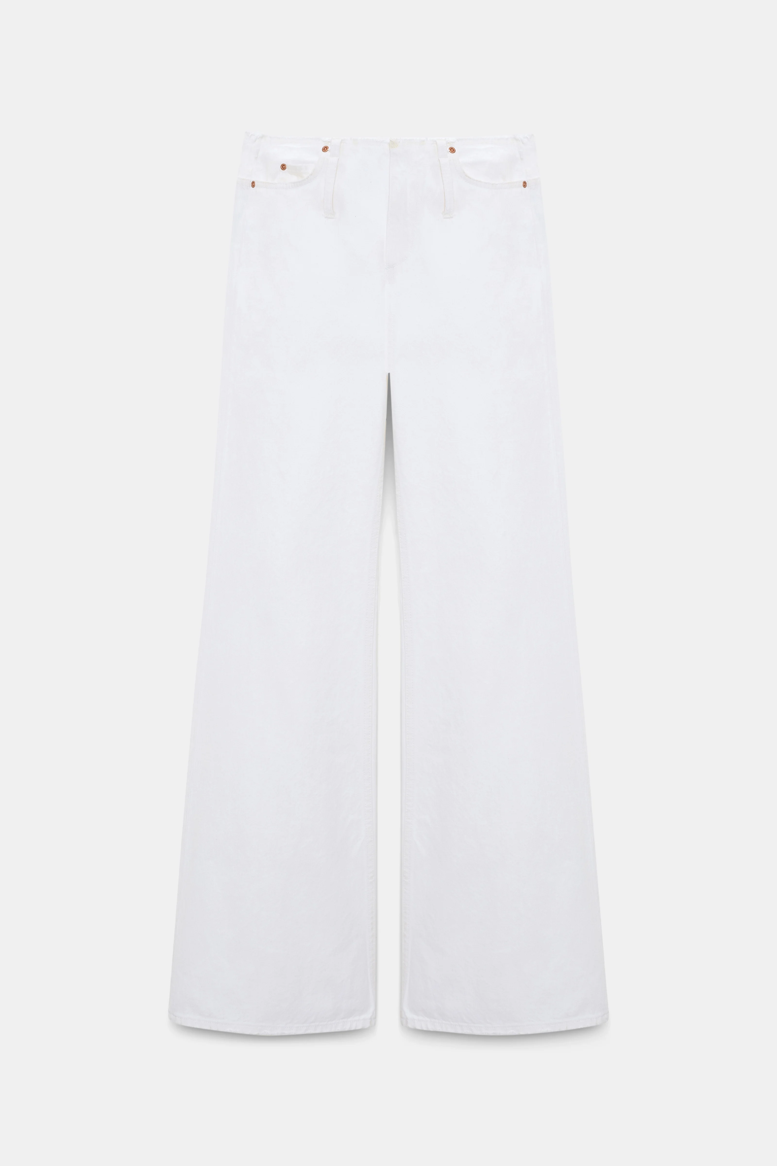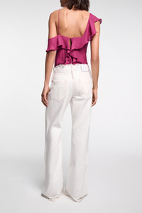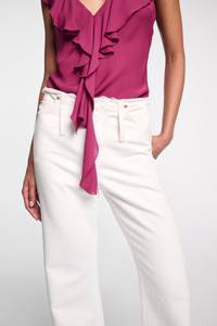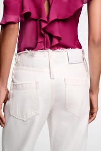 The 5-pocket jeans have a wide leg and narrow frayed waistband. The jeans have a full length and soft feel. Material & Care - 100 % Cotton - Wide leg jeans - Classic 5-pocket styling - Narrow frayed waistband - Long belt loops - Embossed leather logo patch on the back Size & Fit - Our model is 178 cm tall and wears a size S - Wide leg