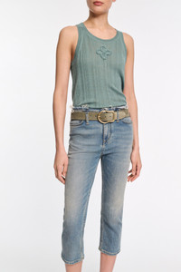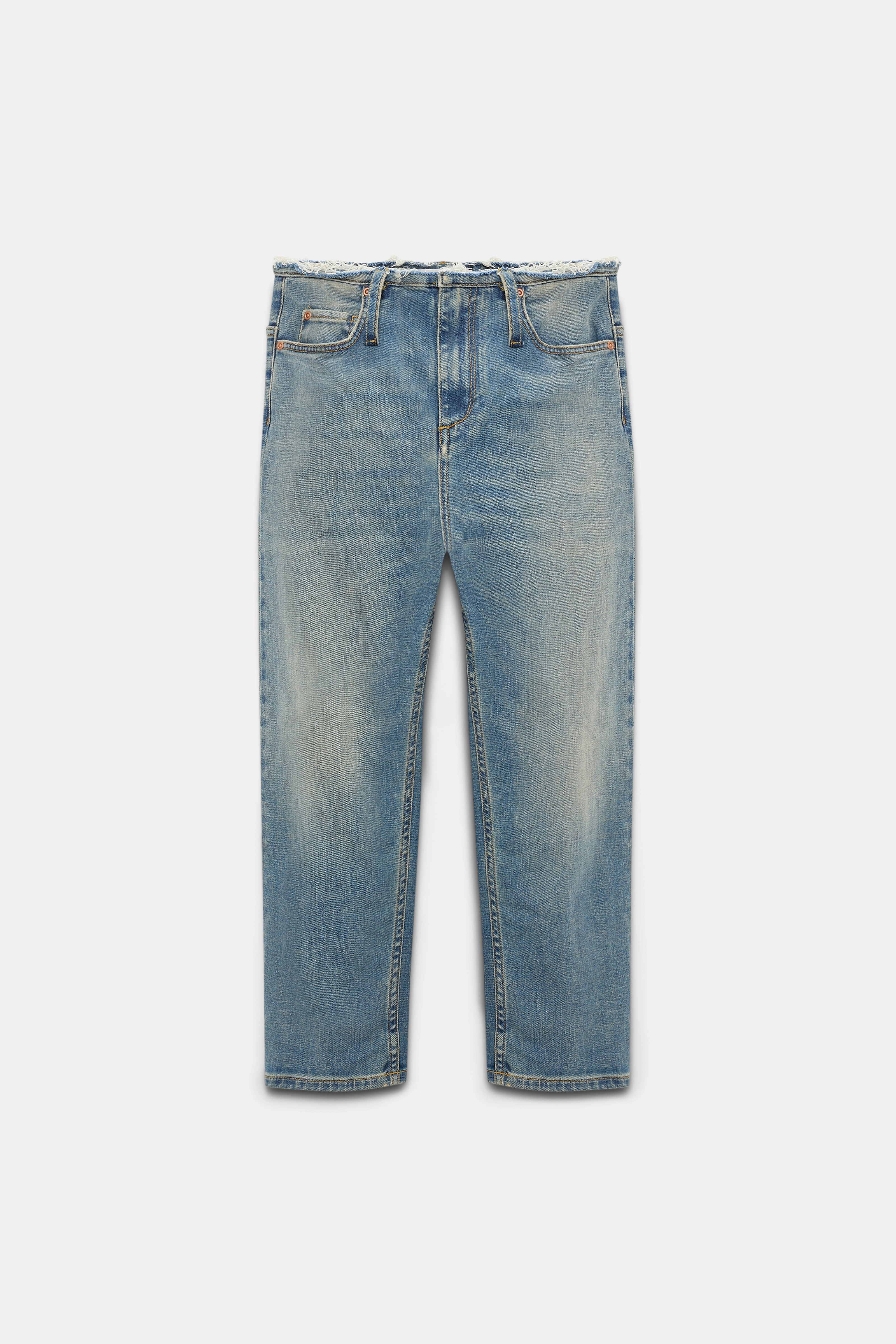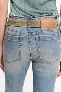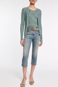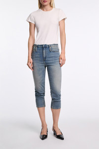 The 5-pocket jeans are fitted and have a narrow frayed waistband. The jeans have a cropped capri length and soft distressed finish. Material & Care - 98 % Cotton, 2 % Elastane - Capri-length jeans - Classic 5-pocket styling - Narrow frayed waistband - Long belt loops - Mild wash / Delicates - Wash with similar colors - Caution, may run - Contains non-textile parts of animal origin Size & Fit - Our model is 178 cm tall and wears a size S - Cropped leg - Fitted