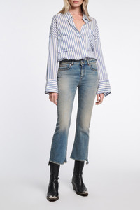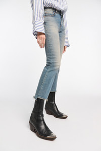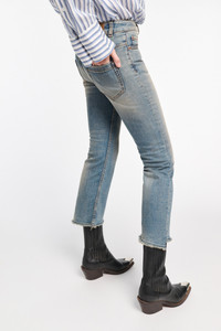 The cropped jeans have a flared leg and raw edge slated ankle. The stylishly distressed style is fitted through the thigh. Material & Care - 99 % Cotton, 1 % Elastane - Cropped flared jeans - Classic five-pocket styling - Signature button closure and hidden fly - Slightly slanted frayed hem - Tabbed sleeves - Gold-tone buttons - Unlined - WE CARE - Fabric supplier produces according to 4sustainability - WE CARE - The wool content is produced in accordance with the Global Recycled Standard (GRS) Size & Fit - Our model is 179 cm tall and wears a size S - Fitted from the waist through the thigh - Cropped, flared leg