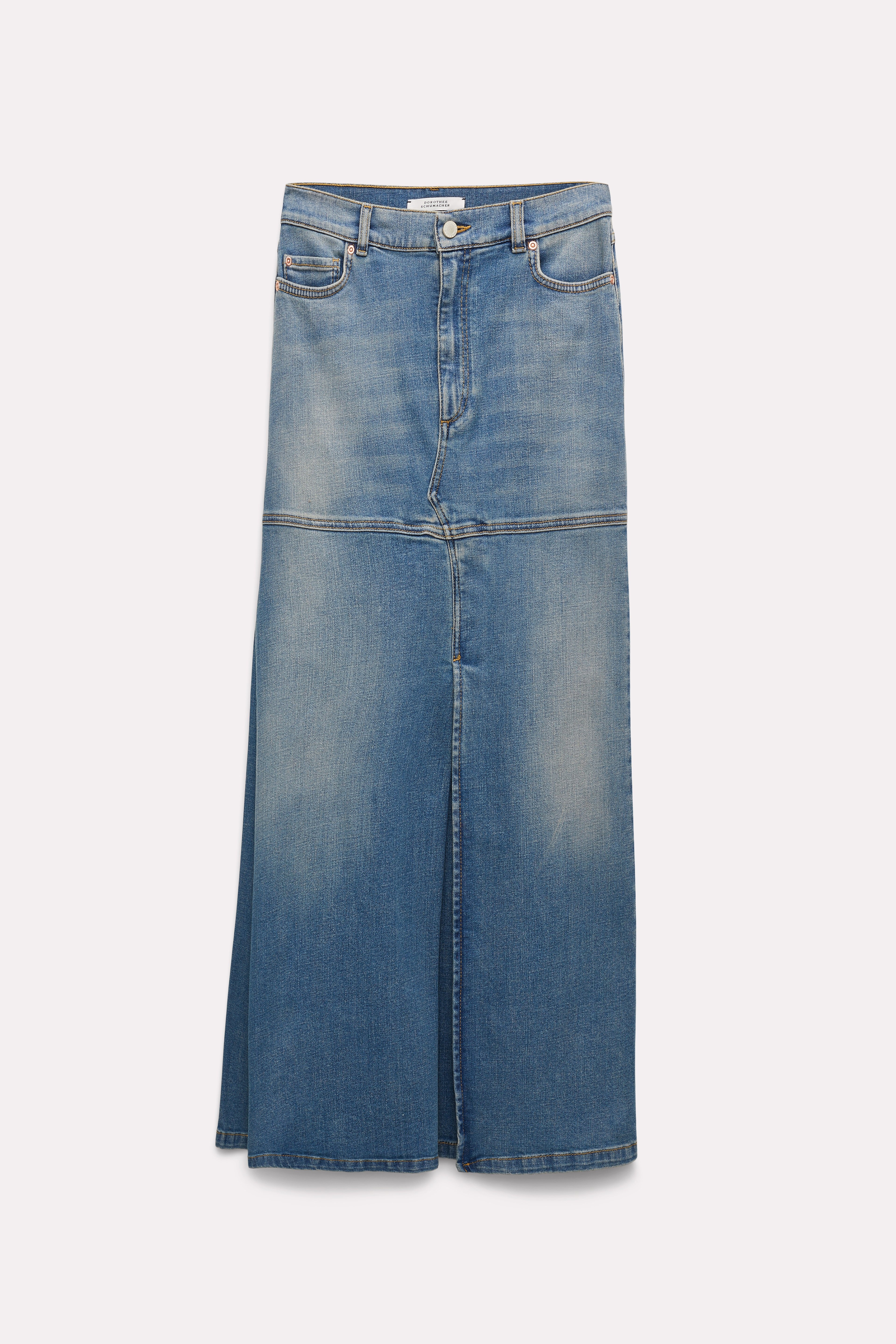 The 5-pocket jean skirt has a front slit and side panel inserts, creating extra volume for a comfortable feel when wearing. Material & Care - 99 % Cotton, 1 % Elastane - Denim skirt with godet inserts - Slanted slit pockets - Center front slit - Back patch pockets - Lined - WE CARE - Cotton content is organic cotton - WE CARE - In order to minimize water consumption, enzymes (rather than stones) were used for the wash of these jeans - Mild wash / delicates - Use mild detergent - Wash with similar colors - Contains non-textile parts of animal origin Size & Fit - Our model is 179 cm tall and wears a size S - Fitted at the waist and hips - Flared hem