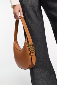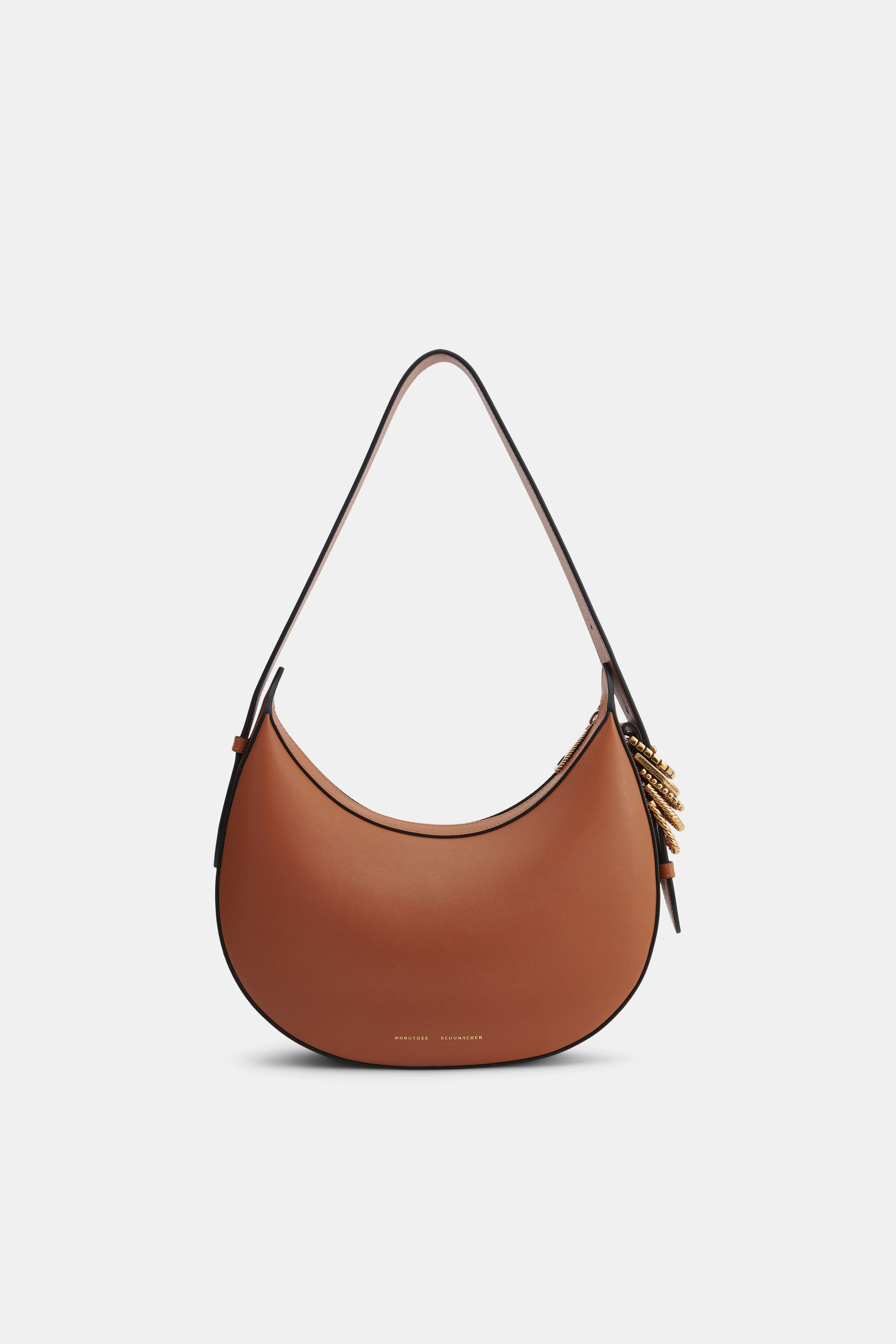 Embracing freedom and individuality. The Half Moon Bag is made in Italy from luxuriously soft calfskin. The hobo-style satchel has a top zip closure and calf suede lining with an integrated back wall credit card slot in leather. Special D-ring hardware loosely attached to the strap references the designer's initials and symbolizes a sense of limitless possibilities. The hardware has mixed textures and a vintage gold-tone finish. The satchel has an adjustable strap and can be worn comfortably on the shoulder. Material & Care - 100 % Leather (calf) - Half Moon Bag in soft calf leather - Calf suede lining - Discrete logo lettering - Adjustable shoulder strap with push-stud hardware - Loosely attached D-ring hardware with mixed textures - Zip closure - Internal back wall credit card slot - Vintage gold-tone hardware and logo - Can be carried on the shoulder - Made in Italy Size & Fit - Dimensions: 16 cm (height) x 29 cm (length) x 4.5 (depth); handle drop: 27 cm