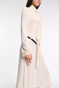 The dress is made from flowing crepe-jersey and has a flounce scarf draped around the neckline. The dress has long sleeves with fitted cuffs and a front slit with concealed snap closure. Material & Care - 100 % Viscose - Dress in flowing crepe-jersey - Draped flounce scarf with silk georgette trim - Center slit with concealed snap at the front - Generous blouse sleeves with fitted cuffs - Gathered shoulders - Asymmetric draped hem - WE CARE - This item is finished according to STANDARD 100 by OEKO-TEX, 22.0.98928 Hohenstein HTTI - Hand wash cold / Machine wash cold - Wash with similar colors Size & Fit - Our model is 178cm tall and wears a size 2 - Fitted at the shoulders - Flared silhouette with generous volume