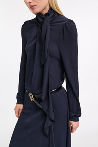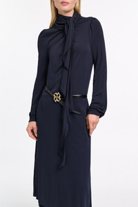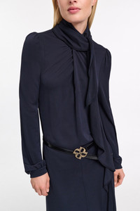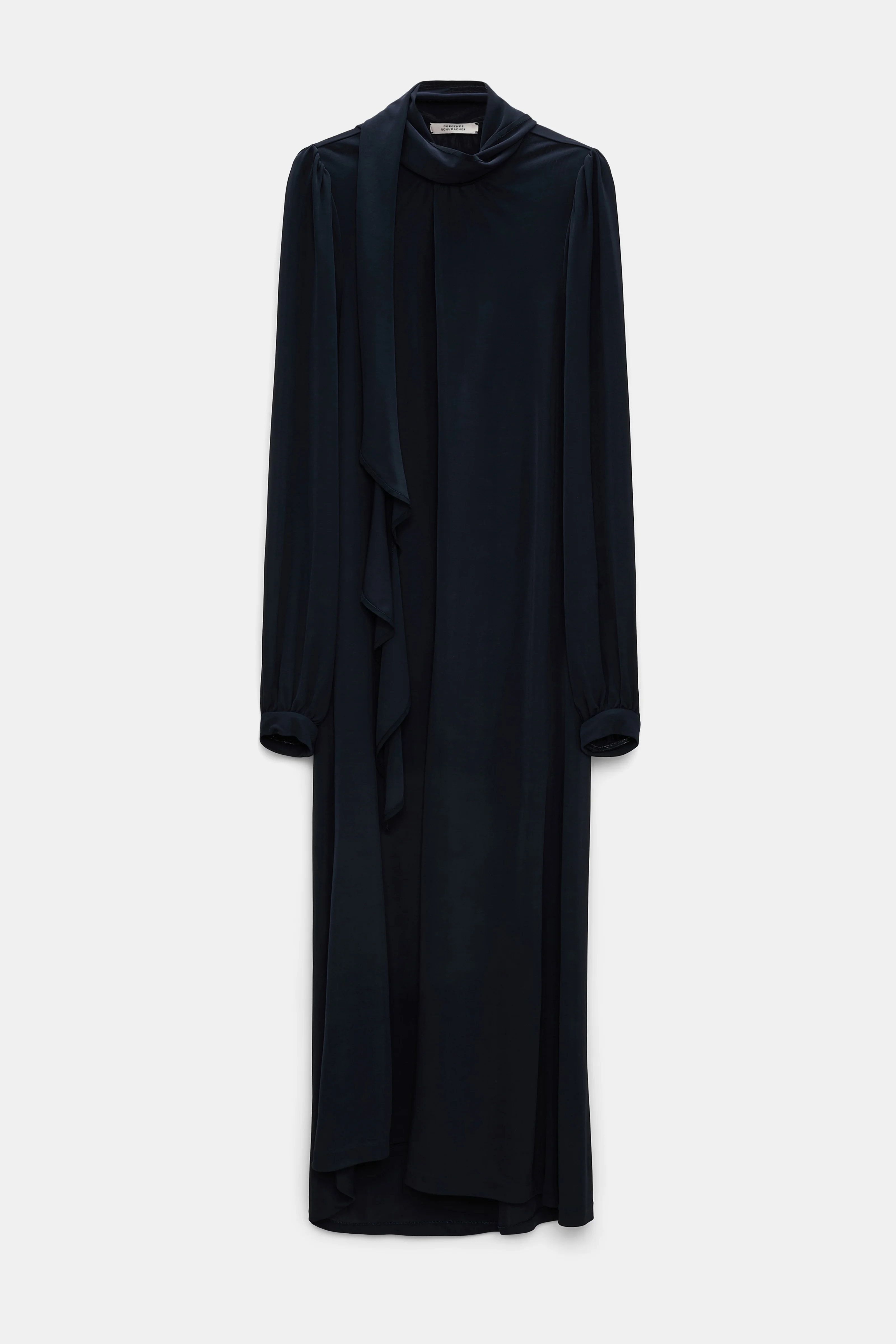 The dress is made from flowing crepe-jersey and has a flounce scarf draped around the neckline. The dress has long sleeves with fitted cuffs and a front slit with concealed snap closure. Material & Care - 100 % Viscose - Dress in flowing crepe-jersey - Draped flounce scarf with silk georgette trim - Center slit with concealed snap at the front - Generous blouse sleeves with fitted cuffs - Gathered shoulders - Asymmetric draped hem - WE CARE - This item is finished according to STANDARD 100 by OEKO-TEX, 22.0.98928 Hohenstein HTTI - Hand wash cold / Machine wash cold - Wash with similar colors Size & Fit - Our model is 178cm tall and wears a size 2 - Fitted at the shoulders - Flared silhouette with generous volume