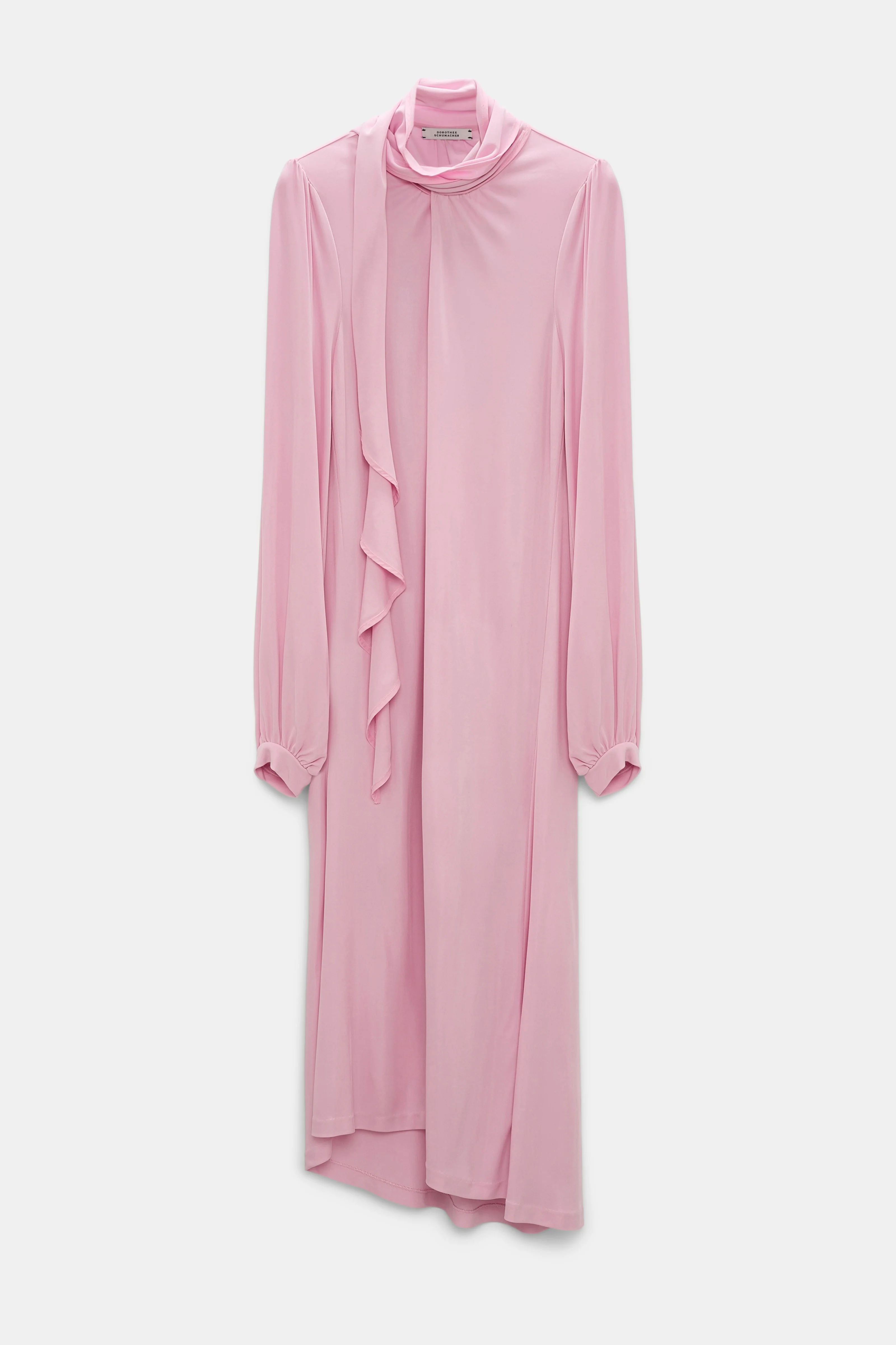 The dress is made from flowing crepe-jersey and has a flounce scarf draped around the neckline. The dress has long sleeves with fitted cuffs and a front slit with concealed snap closure. Material & Care - 100 % Viscose - Dress in flowing crepe-jersey - Draped flounce scarf with silk georgette trim - Center slit with concealed snap at the front - Generous blouse sleeves with fitted cuffs - Gathered shoulders - Asymmetric draped hem - WE CARE - This item is finished according to STANDARD 100 by OEKO-TEX, 22.0.98928 Hohenstein HTTI - Hand wash cold / Machine wash cold - Wash with similar colors Size & Fit - Our model is 180cm tall and wears a size 2 - Fitted at the shoulders - Flared silhouette with generous volume