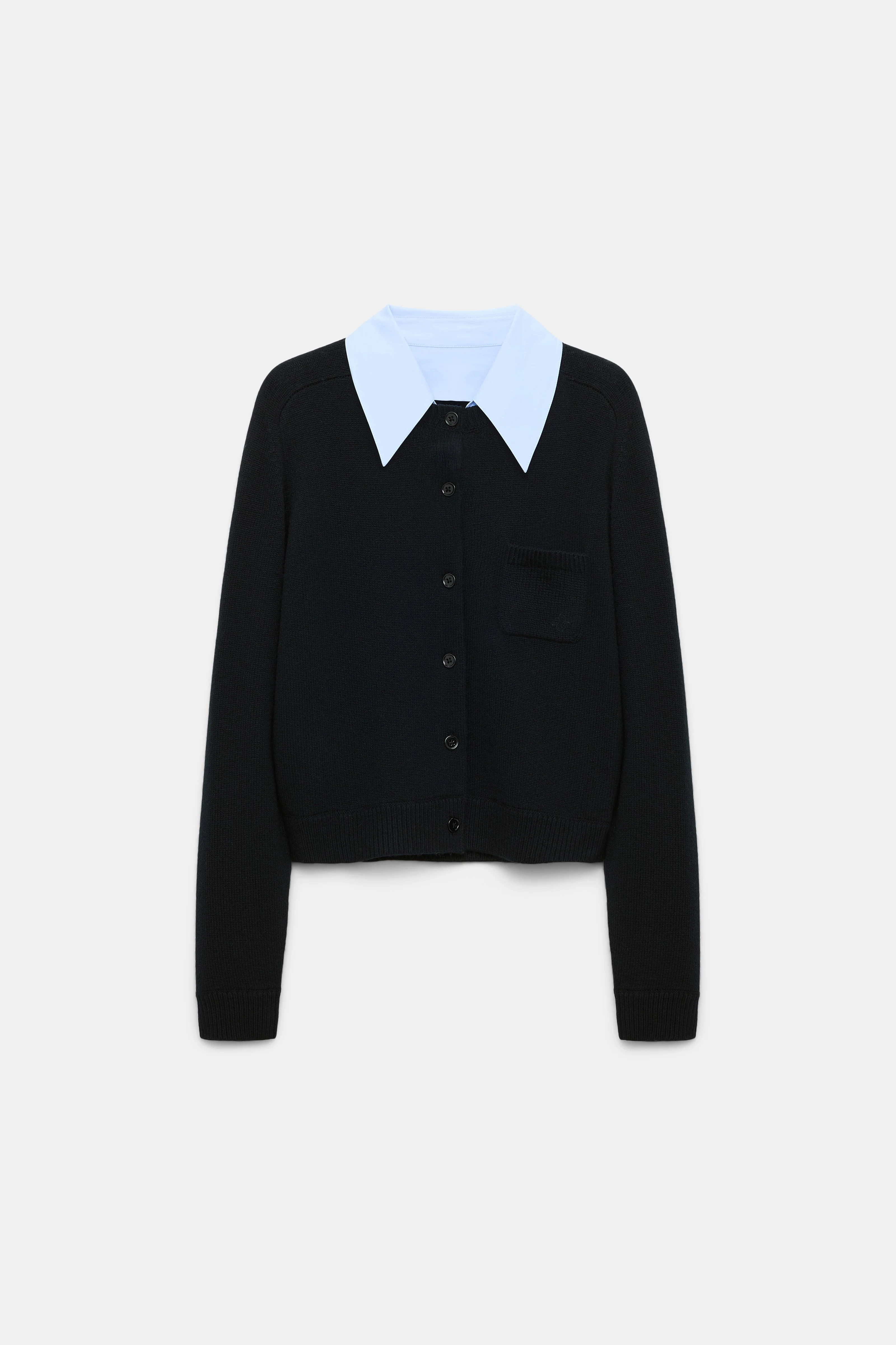 The cardigan is knit in a soft Merino-cashmere mix and features a white poplin collar which can be removed with buttons. The boxy pullover has a round neckline and a chest pocket with D-rose embroidery. Material & Care - 70 % Virgin wool (Merino), 30 % Cashmere - Round neck cardigan with shirt collar in poplin - Contrast color trompe-l'œil collar can be removed with buttons - Chest pocket with D-rose embroidery - Button placket with grosgrain ribbon on the inside - WE CARE - The wool content is mulesing-free - Hand wash cold / Machine wash cold - Wash with similar colors - Reshape in wet condition - Remove all detachable parts before cleaning Size & Fit - Our Model is 178cm tall and wears a size 2. - Boxy cropped fit, fitted at the hem - Raglan sleeves - Relaxed sleeves, fitted cuffs