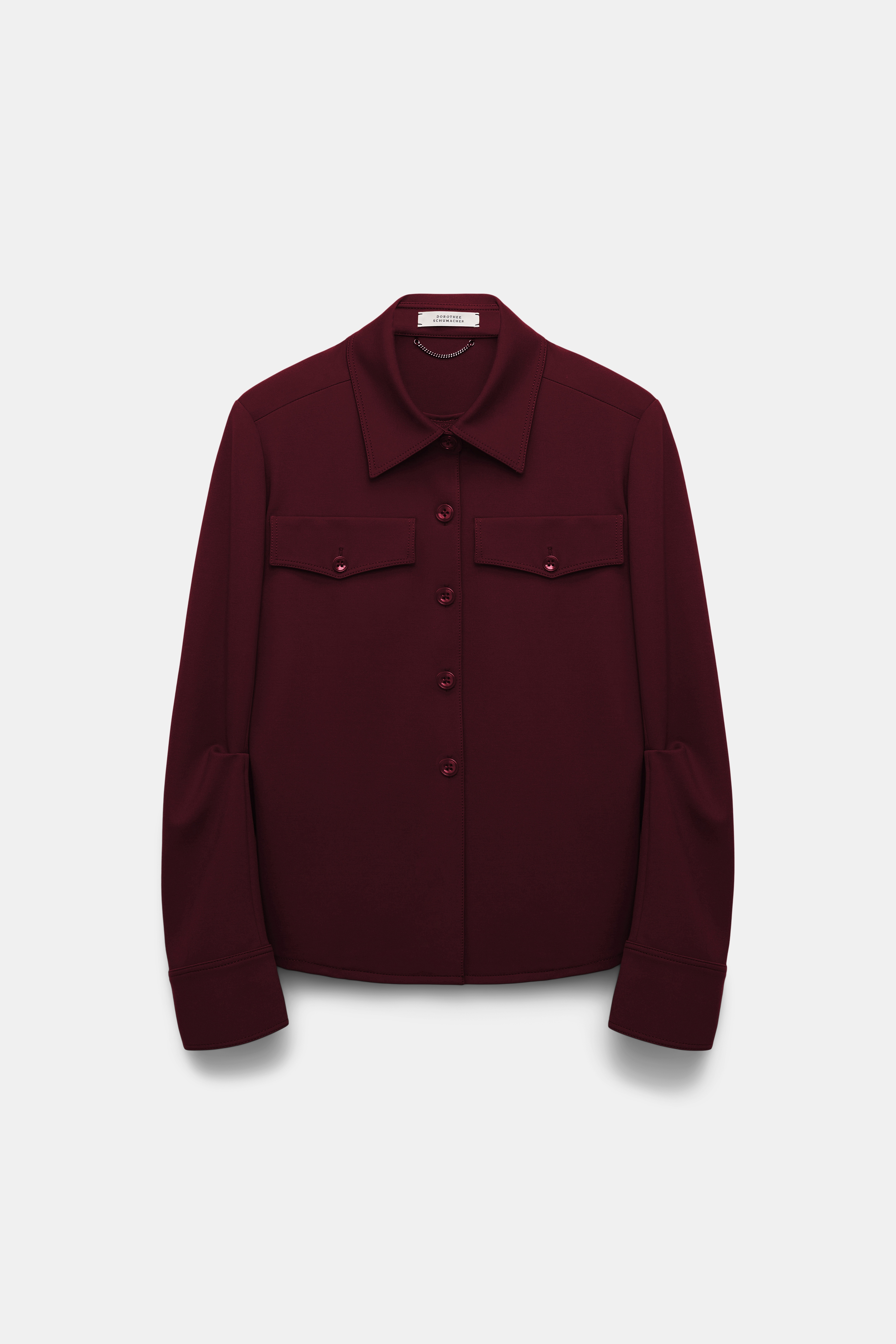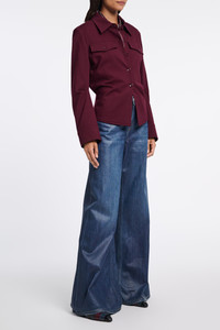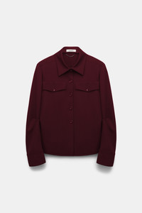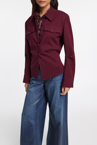 Favorite material. Favorite silhouette. Favorite jacket. The hybrid shirt-jacket is made in our favorite Punto Milano and has a classic collar. The button-down has shoulder pads and buttoned pockets with Western-inspired, curvy flaps. Material & Care - 67 % Viscose, 28 % Polyamide, 5 % Elastane - Tailored shirt-jacket in Punto Milano - Button placket - Flap pocket - Shoulder pads - Dry clean only - No optical brighteners - Do not expose to extreme light - Shield from sharp items Size & Fit - Form-fitting