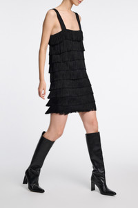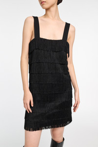 Ready to go out? Don't forget the fun factor: The Punto Milano shift dress is covered with rows of tactile fringe. Material & Care - 62 % Viscose, 32 % Polyamide, 6 % Elastane - Punto Milano dress with allover fringe - Wide straps - Allover fringed ribbon applique - Hidden zip closure - Buttoned back welt pocket - Belt loops Size & Fit - Our model is 179 cm tall and wears a size S - Fitted at the chest - Thick straps - Straight cut