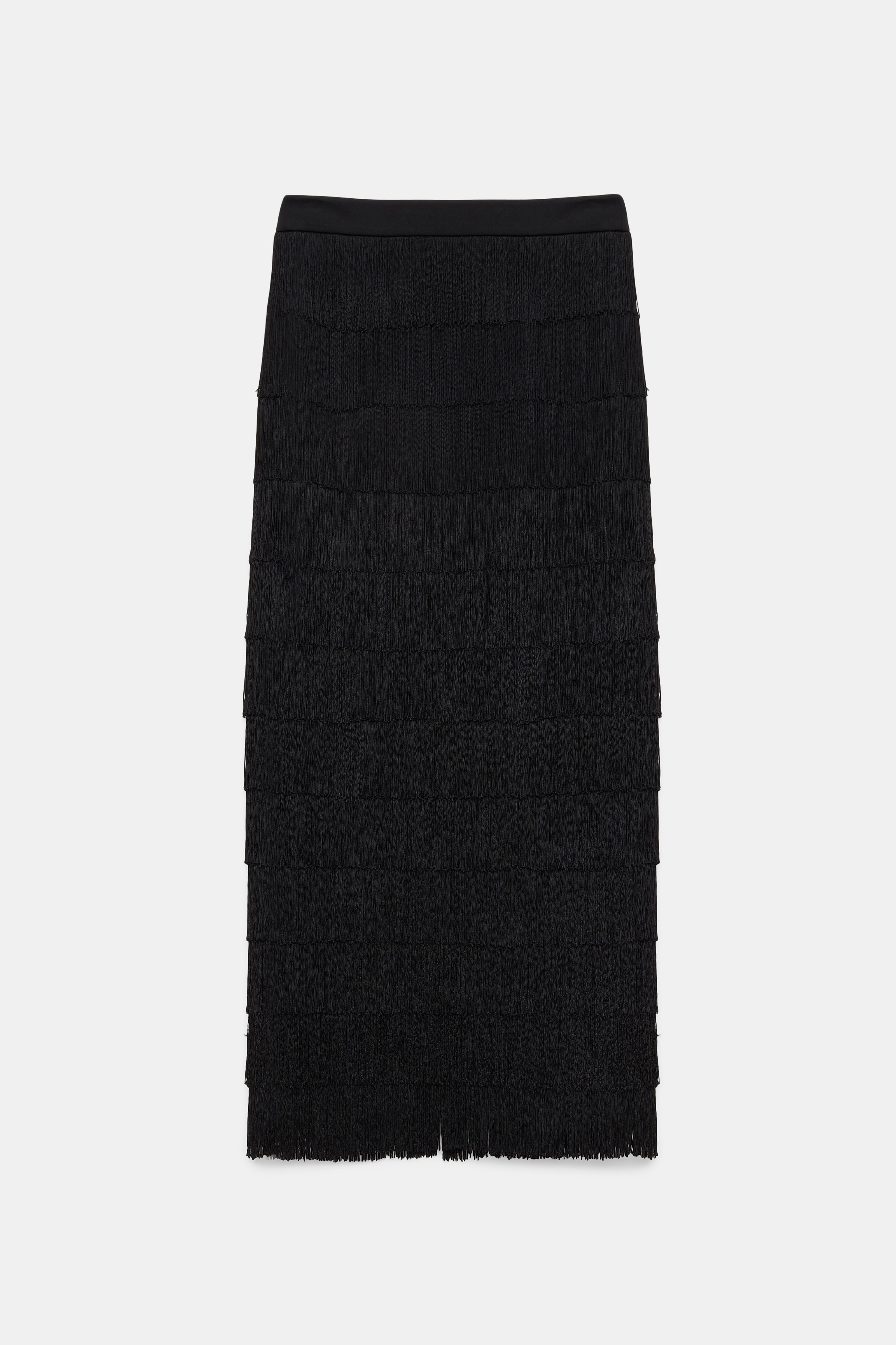 Ready to go out? Don't forget the fun factor: The Punto Milano pencil skirt is covered with rows of tactile fringe. Material & Care - 62 % Viscose, 32 % Polyamide, 6 % Elastane - Punto Milano skirt with allover fringe - Waistband in Punto Milano - Allover fringed ribbon applique - Center back zip closure - Center back slit Size & Fit - Our model is 179 cm tall and wears a size S - Fitted - Straight cut