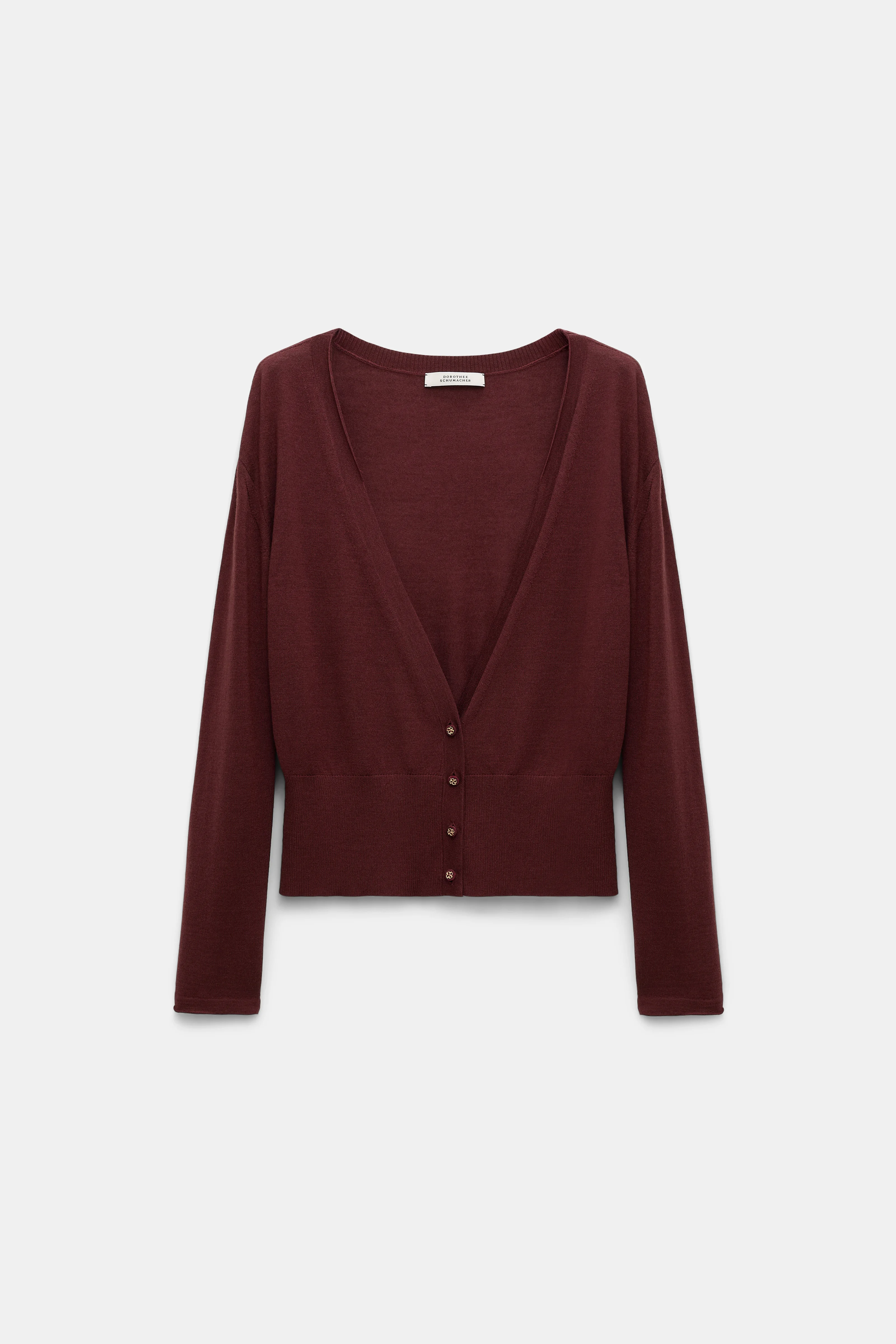 The cardigan has a deep V-neckline with rolled trim and is knit in a fine virgin Merino-silk mix. The loosely fitted style has satin buttons with D-rose detailing and a wide, fitted hem. Material & Care - 75 % Virgin wool (Merino), 25 % Silk - Virgin Merino-silk V-neck cardigan - Open, deep V-neckline - Rolled trim on the neckline - Wide hem - Tonal satin buttons with D-Rose detail - WE CARE - The wool content is mulesing-free - Hand wash cold / Machine wash old - Wash with similar colors Size & Fit - Our model is 179cm tall and wears a size 2 - Loosely fitted at the top - Fitted hem - Dropped shoulders