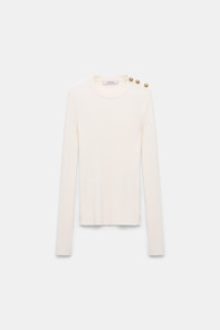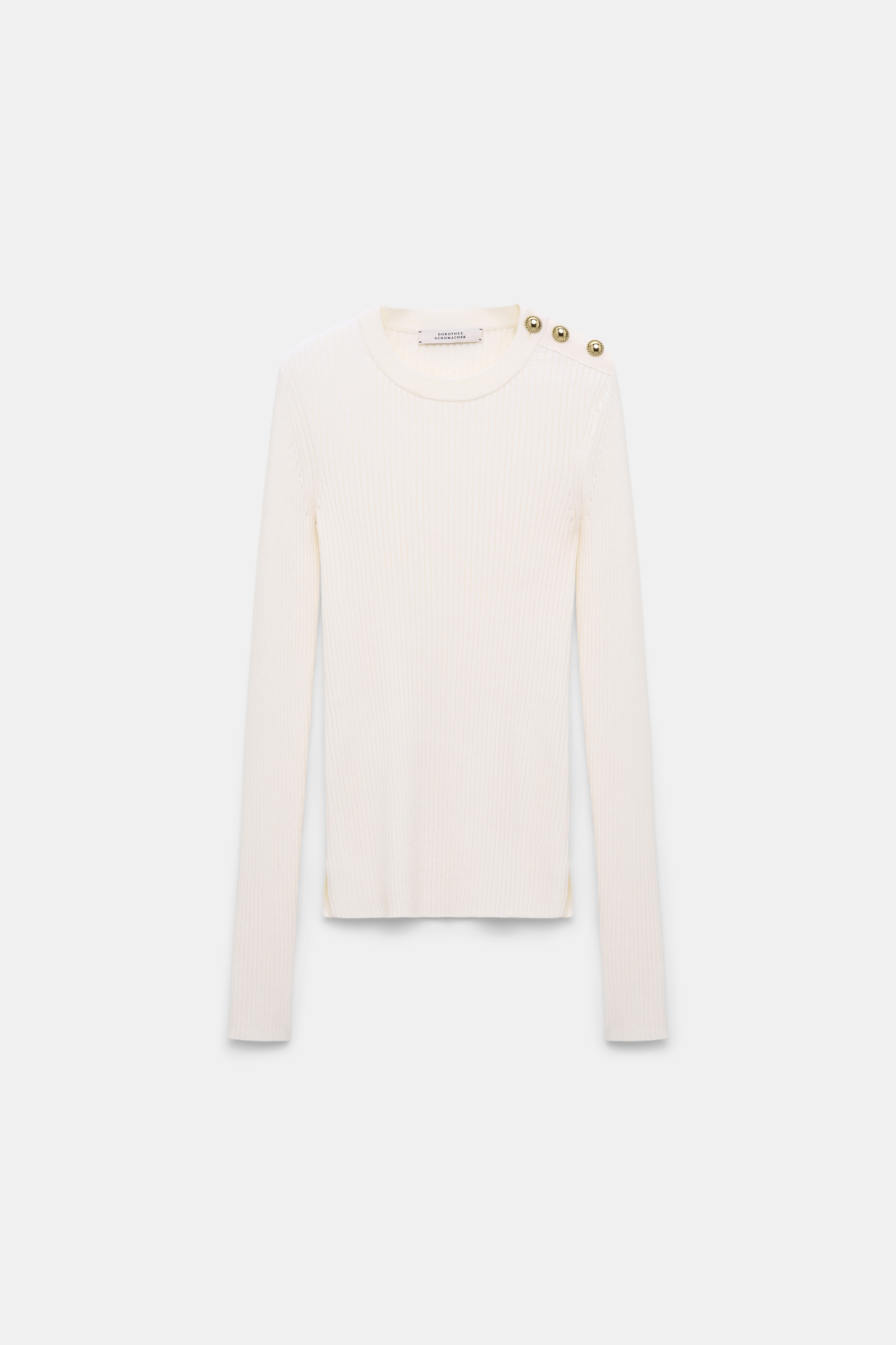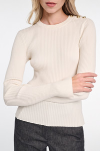 The round neck pullover is made from a stretchy ribbed wool-silk blend and has gold-tone buttons on one shoulder. The fitted style has small slits on the sleeve cuffs and hem. Material & Care - 59 % Wool, 20 % Silk, 18 % Polyamide, 3 % Elastane - Wool-silk blend ribbed pullover - Round neckline - Gold-toned buttons on one shoulder - Small slits on the cuffs and hem Size & Fit - Our model is 179 cm tall and wears a size S - Fitted - Fitted shoulders - Fitted sleeves