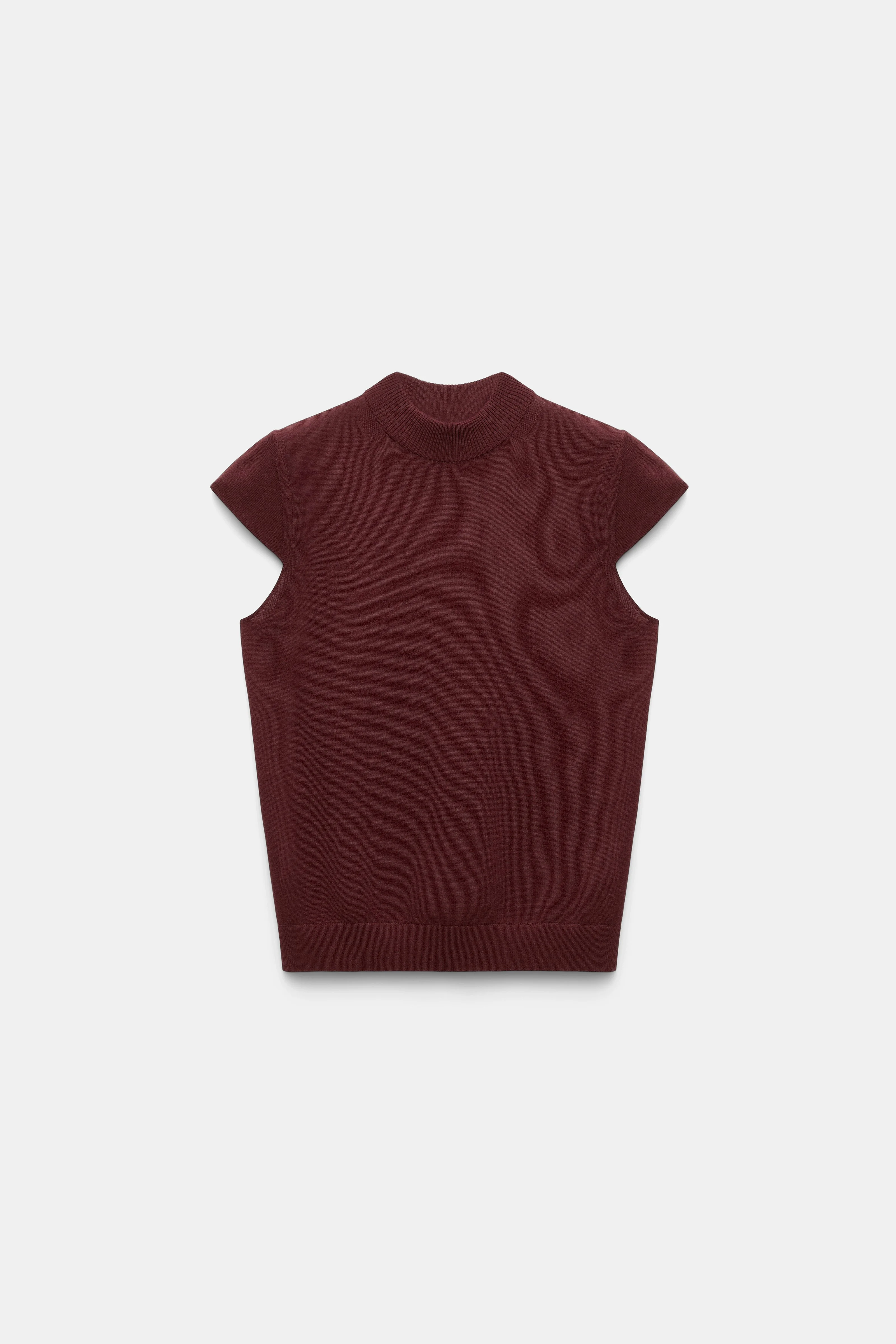 The knit top has a short stand collar and is made from a fine virgin Merino-silk mix. The loosely fitted style has double layer cap sleeves. Material & Care - 75 % Virgin wool (Merino), 25 % Silk - Virgin Merino-silk cap sleeve top with short stand collar - Double layer sleeves - WE CARE - The wool content is mulesing-free - WE CARE - This item is finished according to OEKO-TEX® STANDARD 100, 22.0.98928 Hohenstein - Hand wash cold / Machine wash old - Wash with similar colors Size & Fit - Our model is 179cm tall and wears a size 2 - Loosely fitted