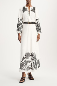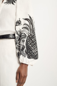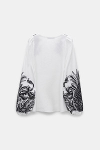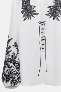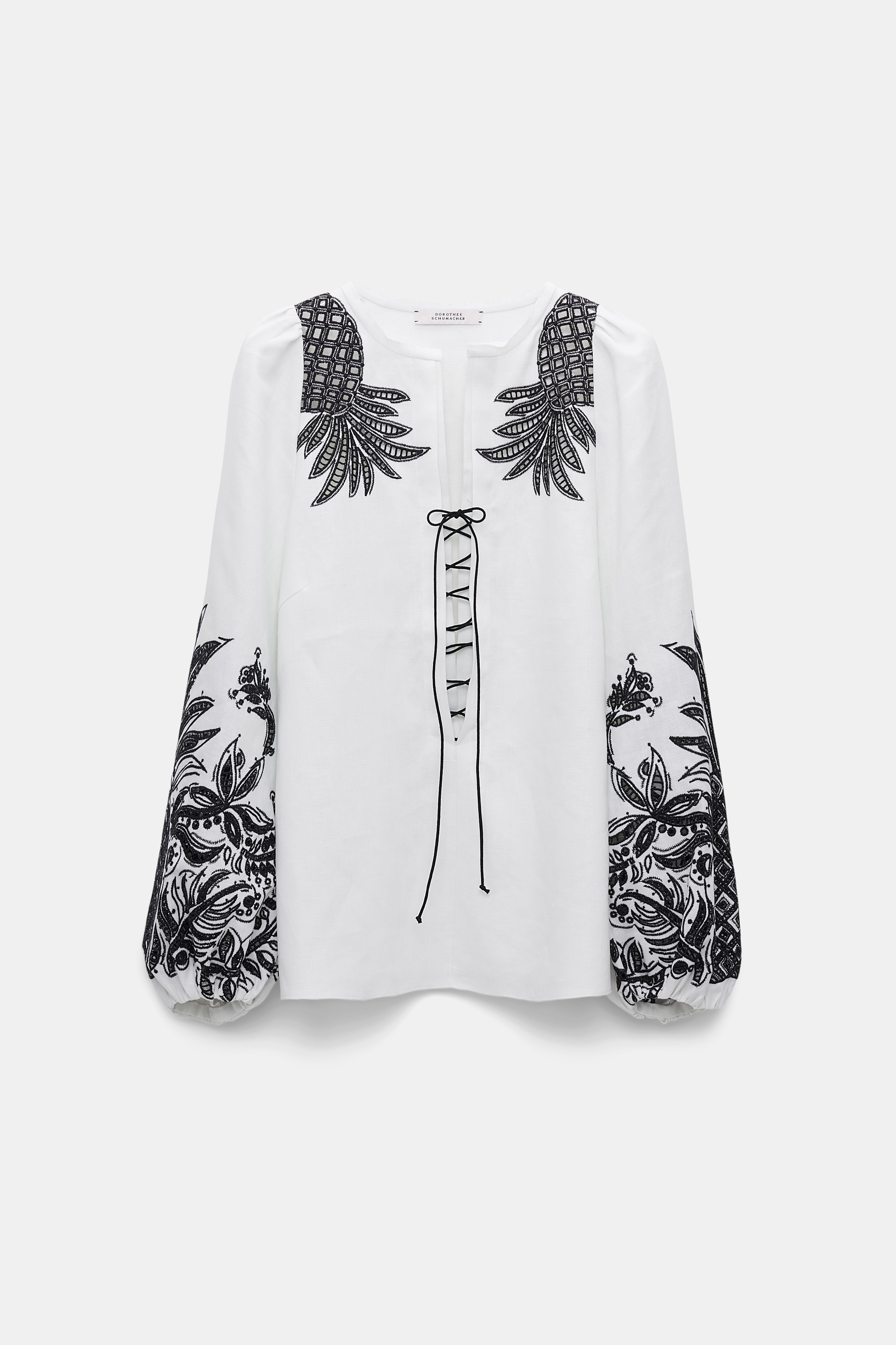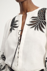 The linen blouse has contrast broderie anglaise patterning and an open neckline, which laces up with a tie. The relaxed-fit style has puff sleeves with gathered cuffs. Material & Care - 100 % Linen - Linen blouse with contrast broderie anglaise - Laced neckline - Puff sleeves - WE CARE - The outer linen fabric has been certified with the EUROPEAN FLAX® label, which proves traceability at every step of linen processing - Dry cleaning only - No optical brighteners - Do not expose to extreme light - Shield from sharp items Size & Fit - Regular shoulders - Relaxed fit