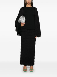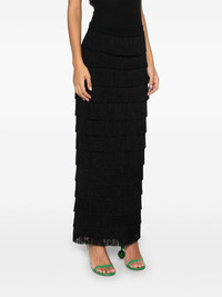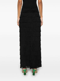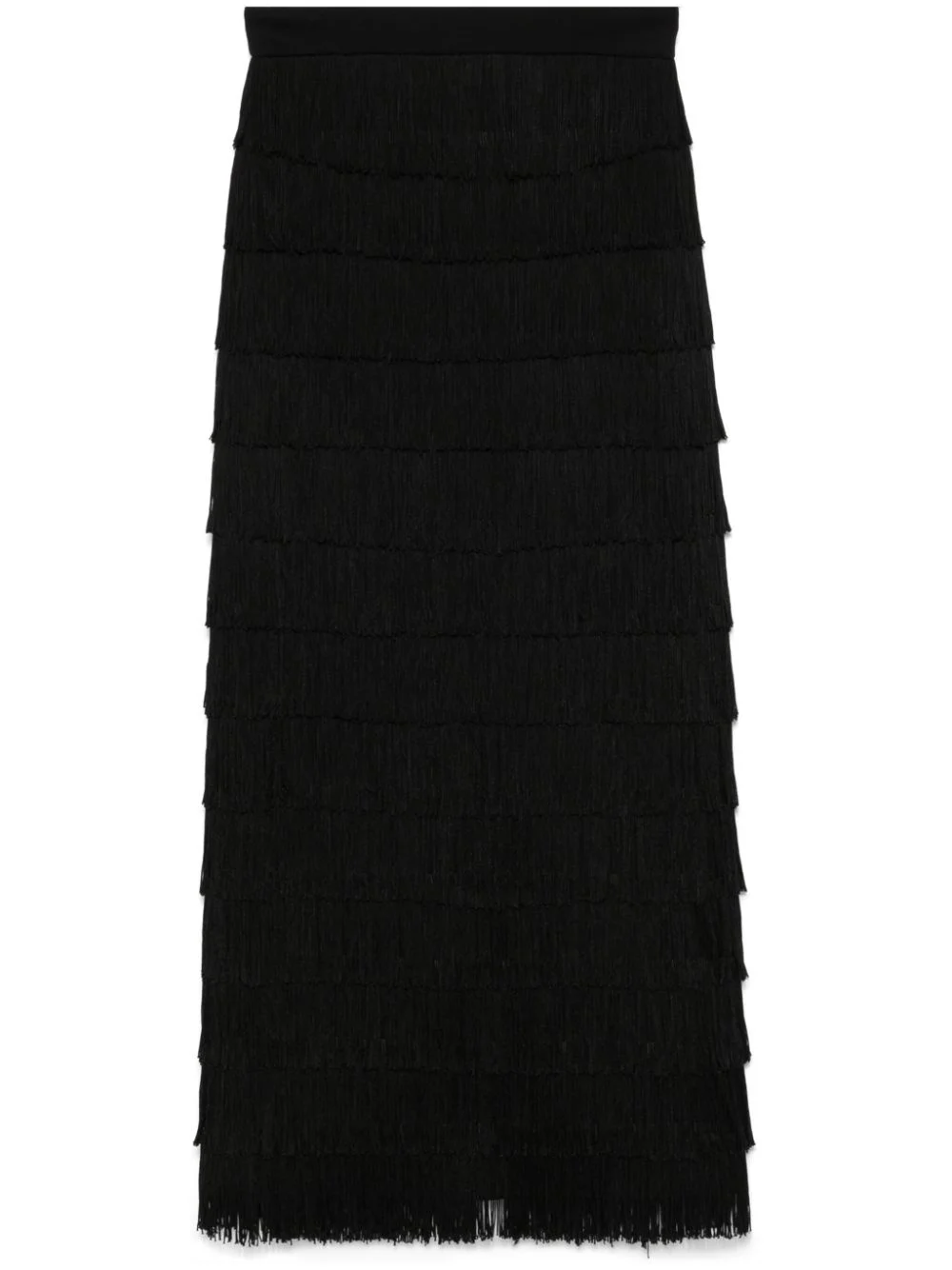 fringed maxi skirt Highlights - Black - Stretch-design - Fringed design - Concealed rear zip fastening - Single rear button fastening - Rear slit - Unlined - Straight hem - Ankle-length Imported Composition Outer: Viscose 62%, Polyamide 32%, Elastane 6% Lining: Acrylic 100% Body: Elastane 6% SIZE & FIT Model measurements Height 5 ft 10 in(1.77 m) Bust/Chest 30.7 in(78 cm) Hips 35.03 in(89 cm) Waist 23.62 in(60 cm) FittingInformation This maxi-length skirt is intended to be worn just below the waist The elasticated waist allows for a comfortable fit Made from a midweight non-stretch fabric, this piece offers minimal elasticity when worn