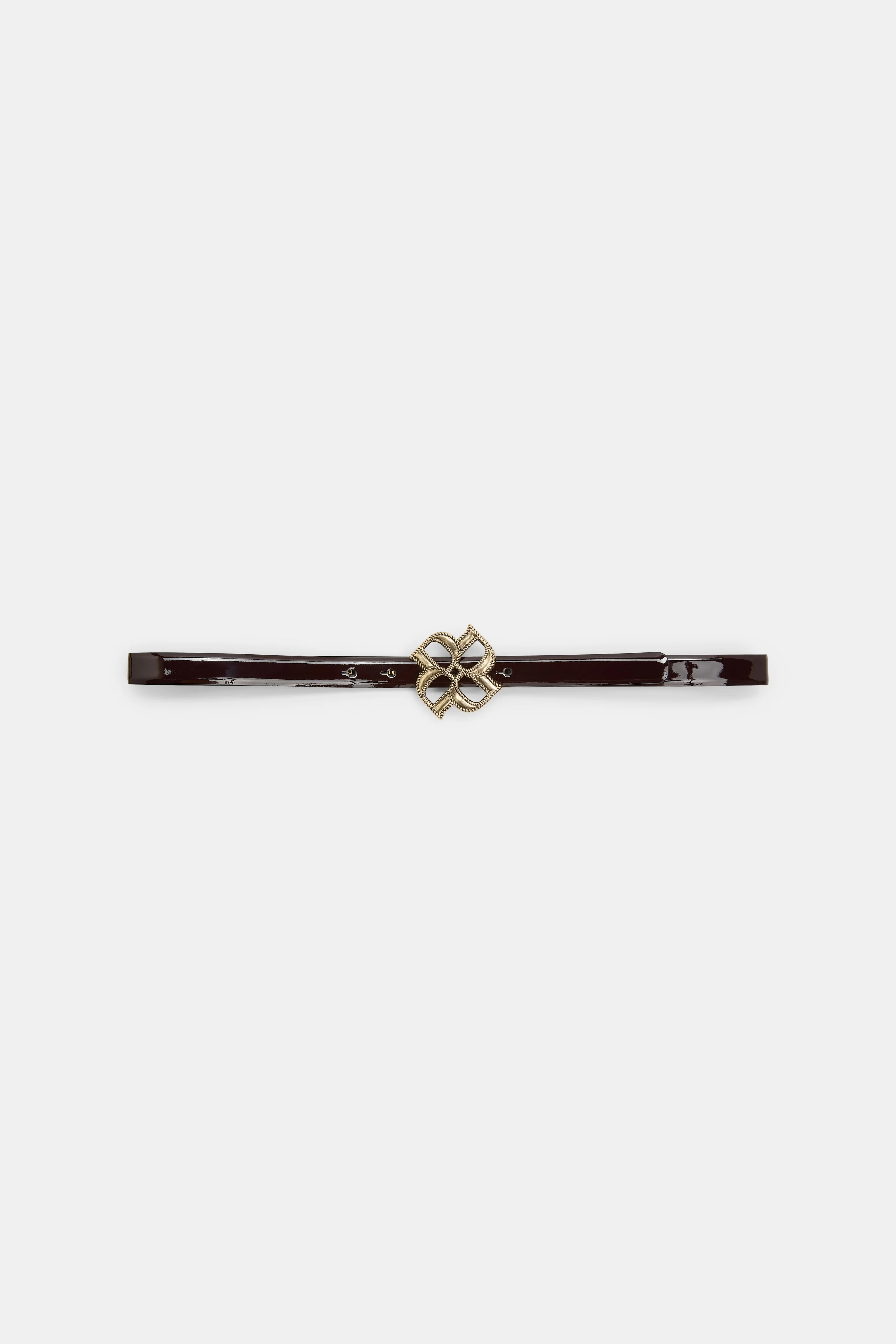 The thin patent leather belt has a D-rose buckle and adjustable push stud closure. Material & Care - 100 % Leather (calf) - D-Rose buckle belt - Patent calf leather outside and lining - Bombatura effect - D-Rose pin buckle in vintage icy gold-tone - Black painted edges Size & Fit - Width: 2 cm - Size measurement taken from pin to middle hole