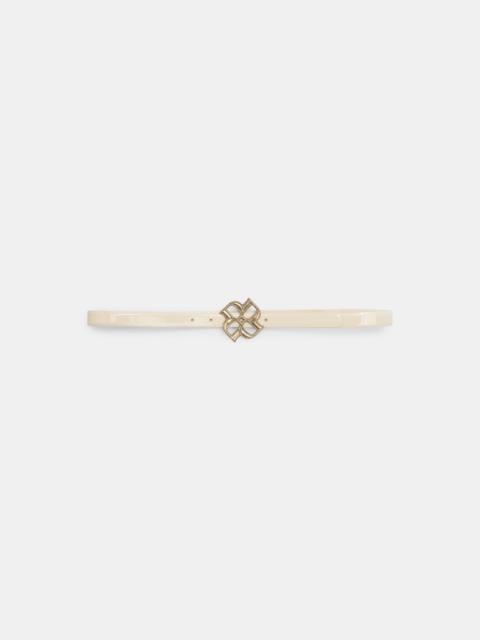 The thin patent leather belt has a D-rose buckle and adjustable push stud closure. Material & Care - 100 % Leather (calf) - D-Rose buckle belt - Patent calf leather outside and lining - Bombatura effect - D-Rose pin buckle in vintage icy gold-tone - Black painted edges Size & Fit - Width: 2 cm - Size measurement taken from pin to middle hole
