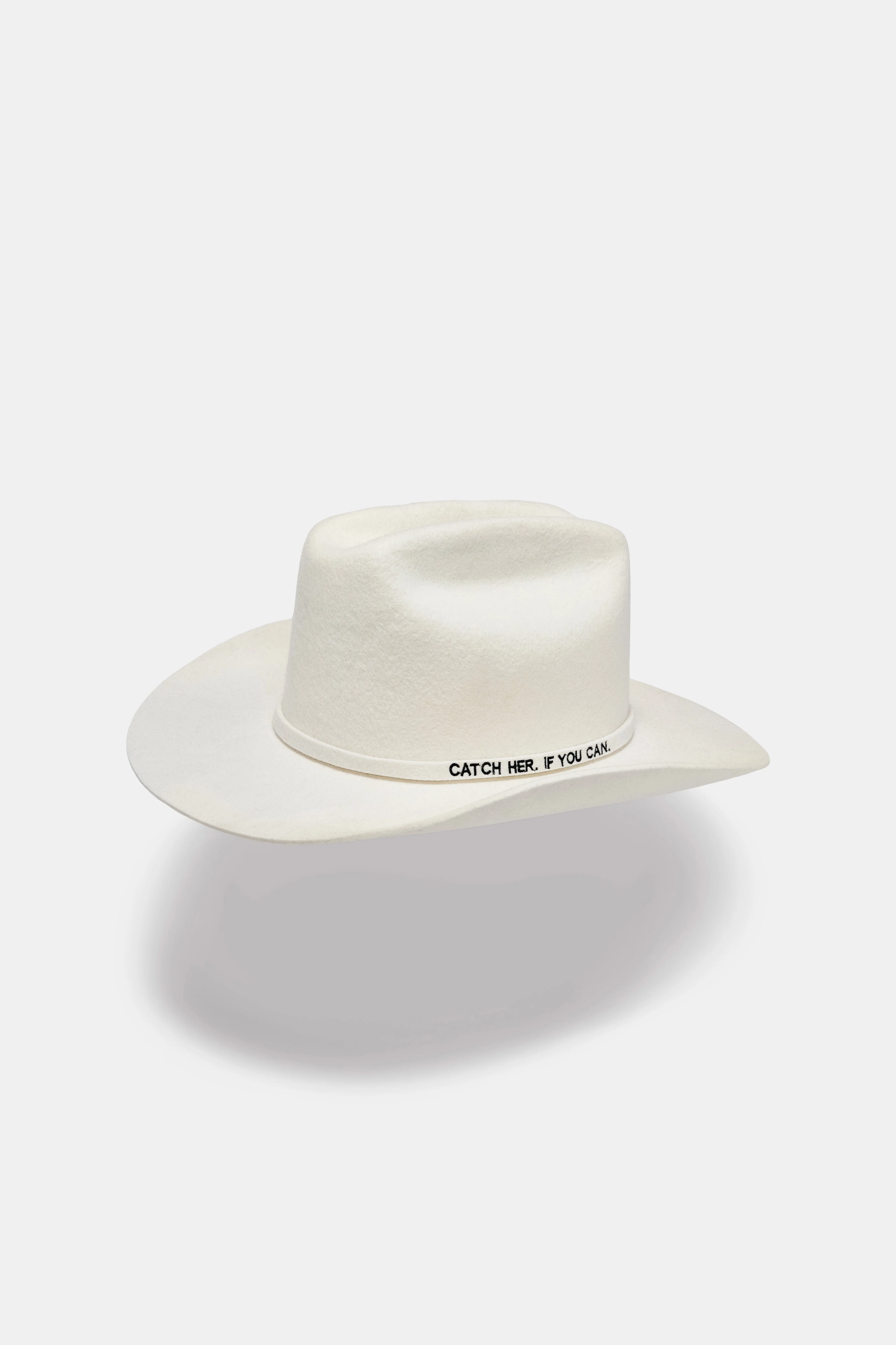 Channeling the look of Western-inspired styling, the felted wool hat features a wide brim and contrast CATCH HER. IF YOU CAN lettering. Material & Care - 100 % Virgin Wool - Felted wool hat - Wide brim - CATCH HER. IF YOU CAN. lettering Size & Fit - One size