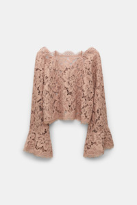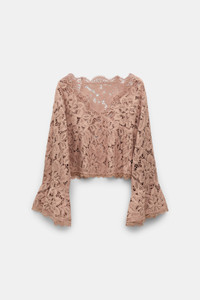 The peek-a-boo blouse is detailed in eyelash lace and has flared trumpet sleeves. The cropped style has a straight neckline in the front, which falls into a V at the back. Pair with the matching dress for a layered look. Material & Care - 100 % Polyester - Cropped blouse in eyelash lace - Straight neckline falls into a V at the back - Trumpet sleeves - Hand wash cold / Machine wash cold - Wash with similar colors - Shield from sharp items Size & Fit - Our model is 178cm tall and wears a size 2 - Dropped shoulders - Casual volume - Cropped
