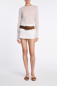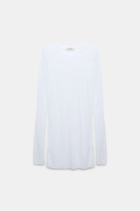 The double layer fine jersey T-shirt has a round neckline and extra long sleeves. The comfortable style has a back seam with a soft gathered drape. Material & Care - 70 % Lyocell, 30 % Cotton - Double layer fine single jersey long sleeve T-shirt - Round neckline with fine rib trim - Coverlock seams - Center back seam with soft gathered drape - Raw edges - WE CARE - This item is finished according to STANDARD 100 by OEKO-TEX, 22.0.98928 Hohenstein HTTI - Hand wash program / Machine wash - Wash with similar colors Size & Fit - Our model is 178cm tall and wears a size S - Casual, fitted shoulders - Loosely fitted - Extra long sleeves