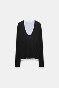 The double layer scoop neck top is made from a fine lyocell-cotton mx. The under layer of the top is white. Material & Care - 70 % Lyocell, 30 % Cotton - Double layer V-neck top in fine single jersey - Scoop neckline - Coverlock seams - Top layer with ribbed trim on the neckline Size & Fit - Slight dropped shoulders - Relaxed body