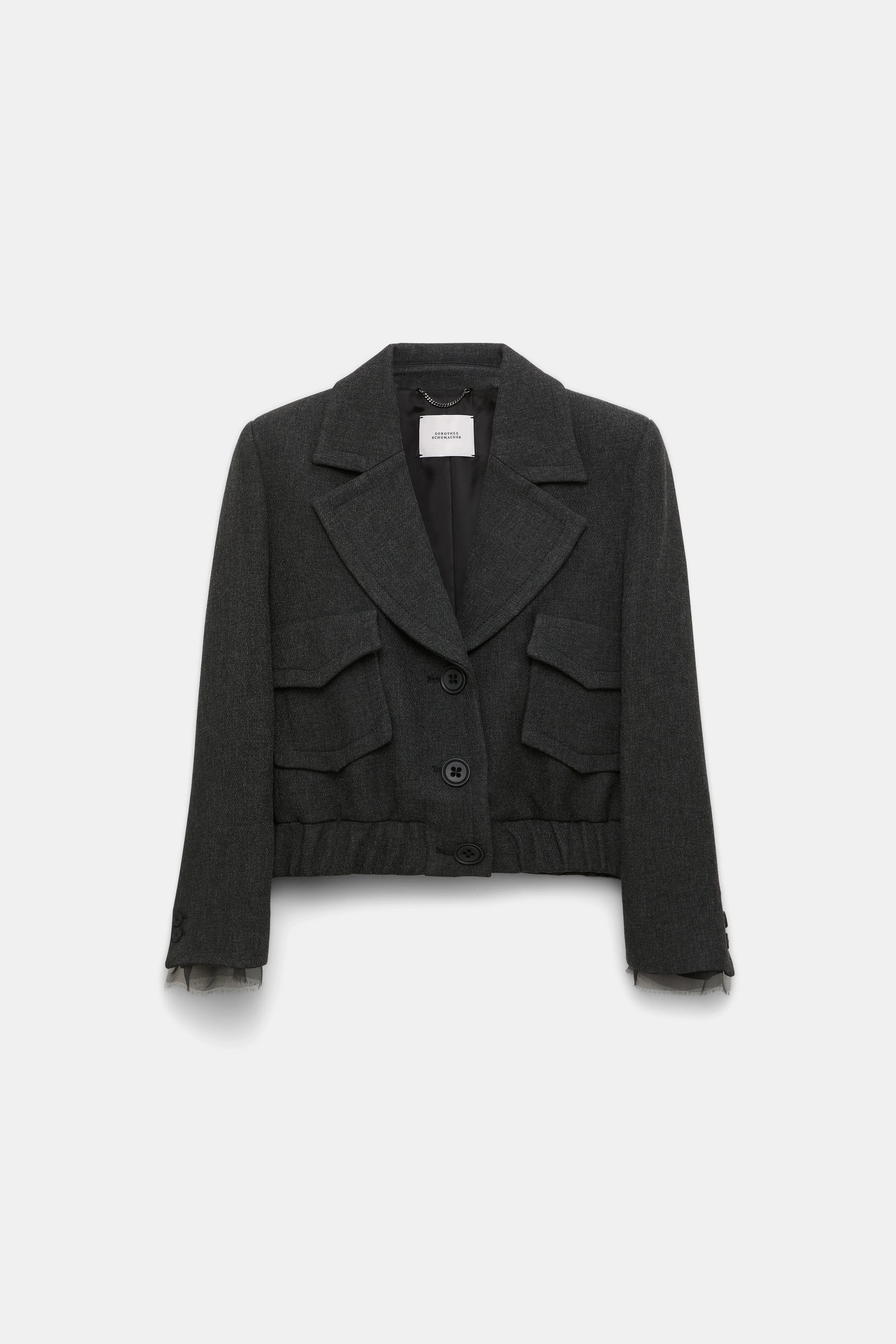 The cropped blouson jacket is made from triple layer fabric and has buttoned cuffs with tonal organza layer detailing. The indoor/outdoor style has a notched collar and can be worn as a suit with the matching pants. Material & Care - 62 % Viscose, 20 % Polyacrylic, 10 % Polyester, 8 % Wool - Cropped blouson in triple-layer fabric - Notched collar - Flap patch pockets - Gathered elastic hem - Sleeve with organza cuff detail - Lined - Dry clean only - No optical brighteners - Do not expose to extreme light - Shield from sharp items Size & Fit - Our Model is 178cm tall and wears a size 2. - Slim tailored fit - Cropped sleeves - Cropped body