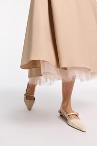 The swing skirt is made from lightweight cotton and has a tulle underskirt, which peeks out at the hemline. The high waist style has a hidden back zip closure. Material & Care - 100 % Cotton - Lightweight cotton skirt with tulle underskirt - In-seam pockets - In-seam center back zip - Hand wash program / Machine wash - Wash with similar colors Size & Fit - Our model is 178cm tall and wears a size 2 - High waist - A-line