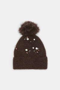 Colored in a dark shade of chocolate, the hat is knit in an extra soft new alpaca mix and embellished with pearl and metallic beading. Material & Care - 72 % Alpaca, 20 % Polyamide, 5 % Virgin Wool, 3 % Elastane - Hat - Knit with new alpaca yarn - Hand-embellished with pearls and metallic elements - Pom-pom - WE CARE - The wool content is mulesing-free - WE CARE - The wool & alpaca yarns are finished according to globally recognized standards promoting animal welfare and land management. - Hand wash cold / Machine wash old - Wash with similar colors Size & Fit - Classic hat shape with wide cuff
