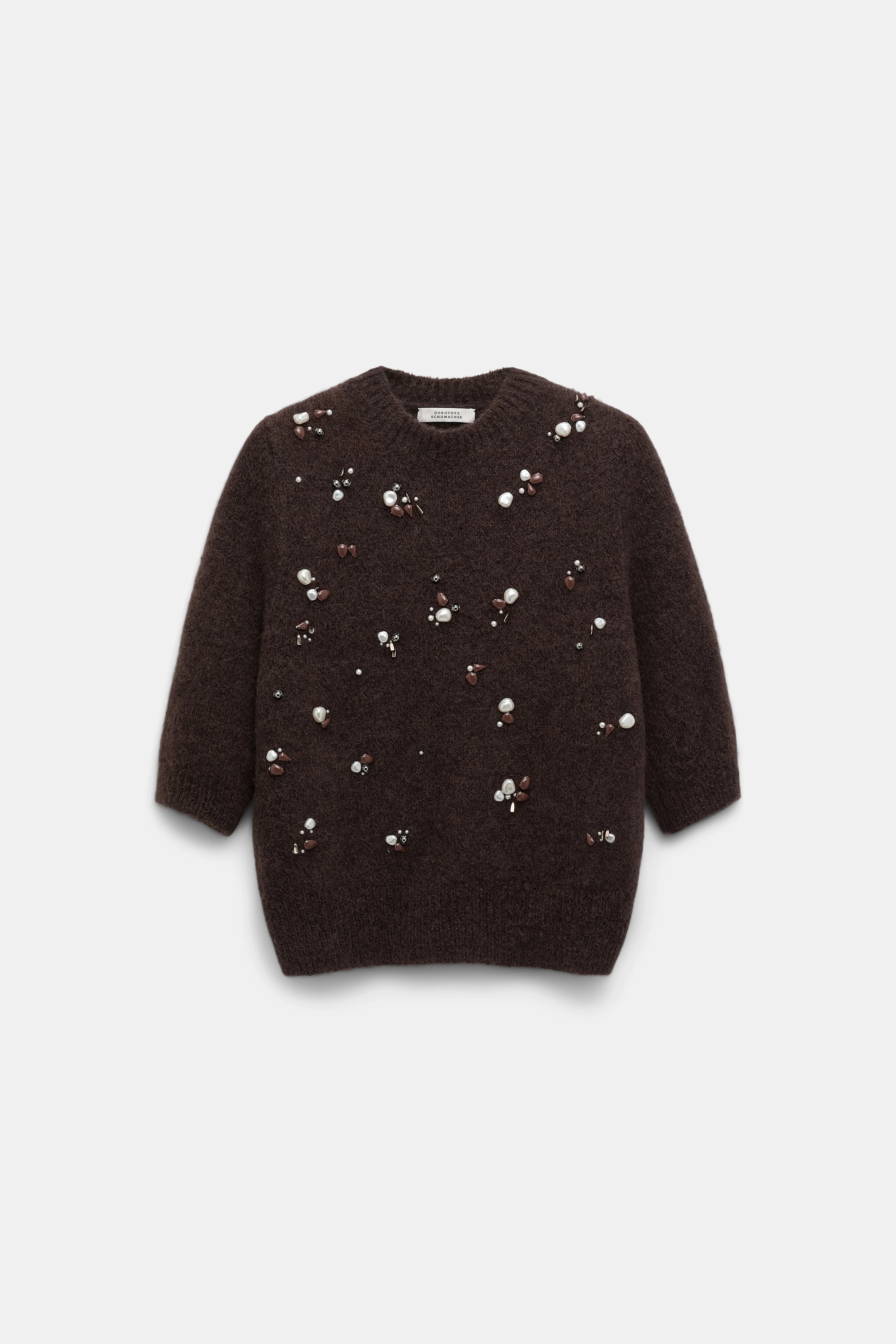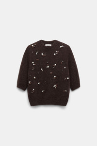 Colored in a dark shade of chocolate, the half sleeve pullover is knit in an extra soft new alpaca mix and embellished with pearl and metallic beading. Material & Care - 72 % Alpaca, 20 % Polyamide, 5 % Virgin Wool, 3 % Elastane - Round neck half-sleeve pullover - Knit with new alpaca yarn - Hand-embellished front with pearls and metallic elements - WE CARE - The wool content is mulesing-free - WE CARE - The wool & alpaca yarns are finished according to globally recognized standards promoting animal welfare and land management. - Hand wash cold / Machine wash old - Wash with similar colors Size & Fit - Our model is 178cm tall and wears a size 2 - Loosely fitted - Fitted shoulders