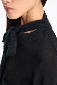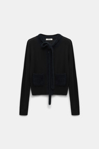 The cropped cardigan is knit in virgin Merino wool and features a tie neckline & detailing in our softest, fluffy wash finish Merino-cashmere mix. Material & Care - 86 % Virgin wool (Merino), 10 % Cashmere, 3 % Polyamide, 1 % Elastane - Virgin Merino round neck cardigan - Ribbon, neckline, button placket and pockets in “fluffy knit” wash Merino-cashmere - WE CARE - The wool content is mulesing-free - WE CARE - This item is finished according to OEKO-TEX® STANDARD 100, 22.0.98928 Hohenstein - Hand wash cold / Machine wash old - Wash with similar colors Size & Fit - Our model is 180cm tall and wears a size 2 - Cropped, loosely fitted - Slight dropped shoulders