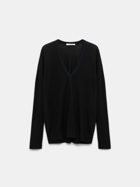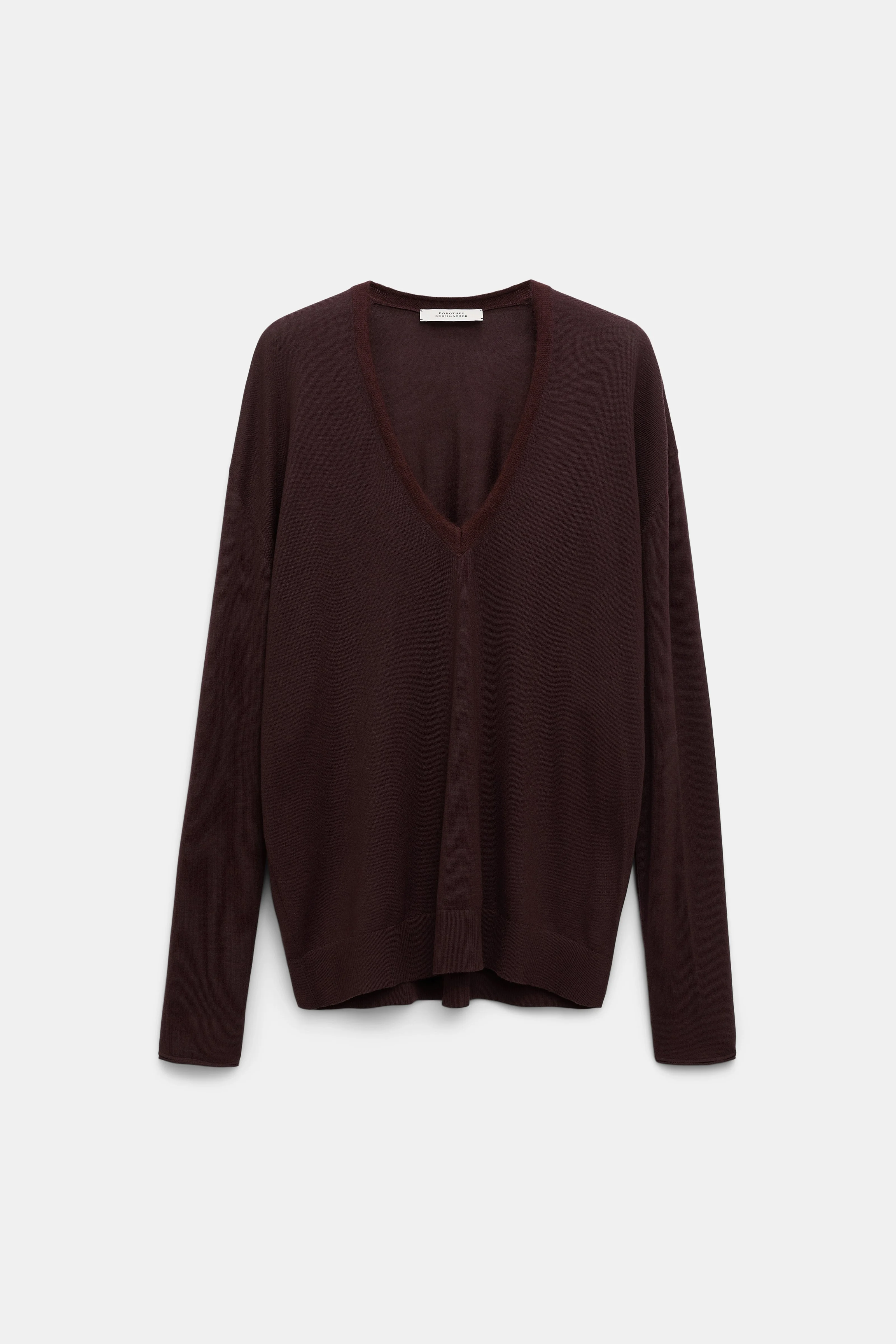 The pullover is knit in virgin Merino wool and features a V-neckline in our softest, fluffy wash finish Merino-cashmere mix. Material & Care - 94 % Virgin wool (Merino), 3 % Polyamide, 2 % Cashmere, 1 % Elastane - Virgin Merino deep V-neck pullover - Neckline trim in “fluffy knit” wash Merino-cashmere - WE CARE - The wool content is mulesing-free - WE CARE - This item is finished according to OEKO-TEX® STANDARD 100, 22.0.98928 Hohenstein - Hand wash cold / Machine wash old - Wash with similar colors Size & Fit - Our model is 178cm tall and wears a size 2 - Loosely fitted at the top, fitted at the hips - Dropped shoulders - Relaxed sleeves, fitted rolled cuffs
