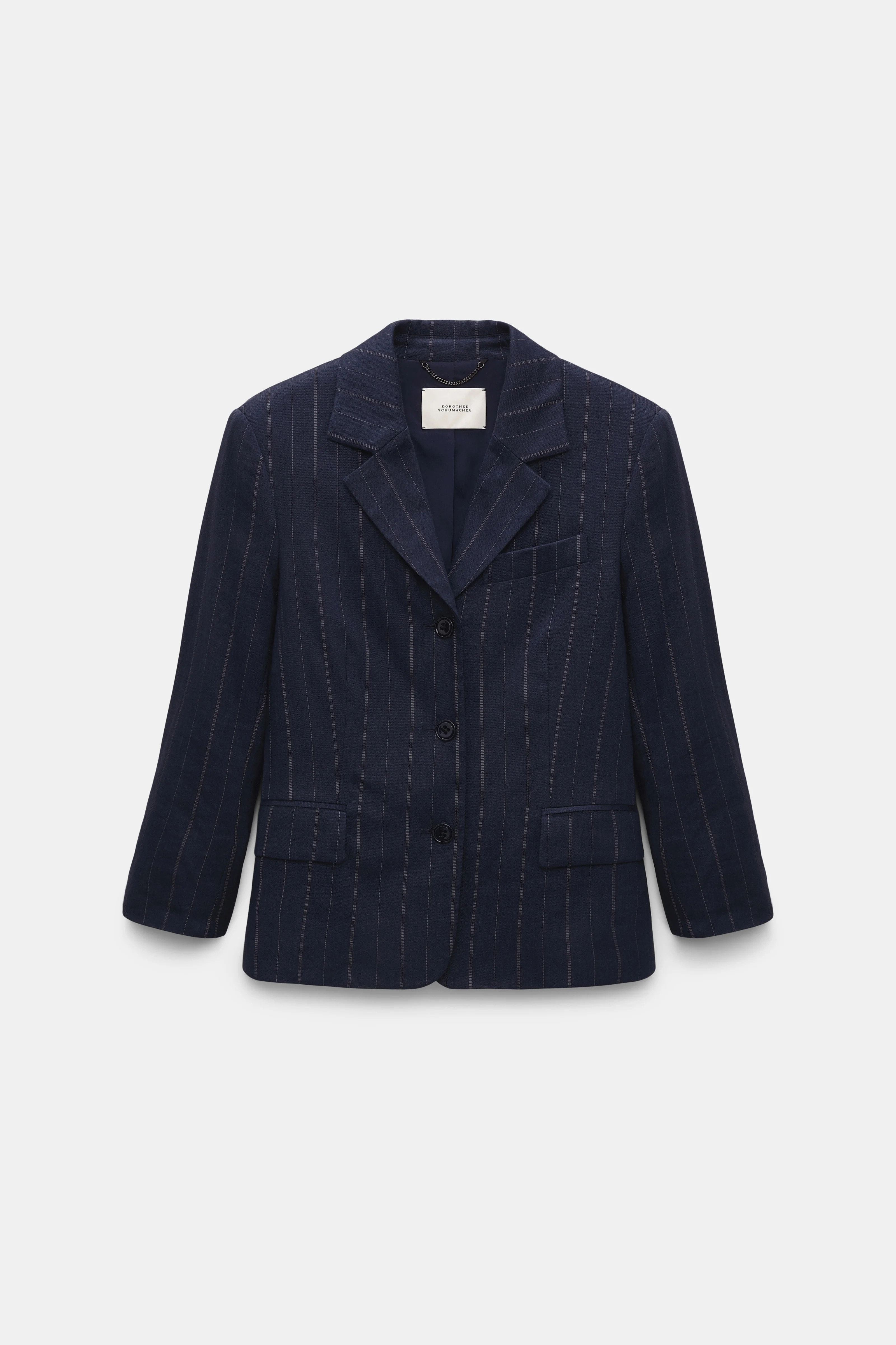 The new suiting is (pin)striped: Crafted in a linen blend, the pinstripe blazer features a slim silhouette and cropped sleeves. The tailored style can be worn as part of a suit with the matching shell and pants. Material & Care - 52 % Linen, 45 % Viscose, 2 % Elastane, 1 % Polyester - Cropped sleeve pinstripe blazer - Notched lapel - Flap pockets - Chest pockets - Classic cuffs - Dry clean only - No optical brighteners - Do not expose to extreme light - Shield from sharp items Size & Fit - Our model is 180cm tall and wears a size 2 - Fitted - Cropped sleeves