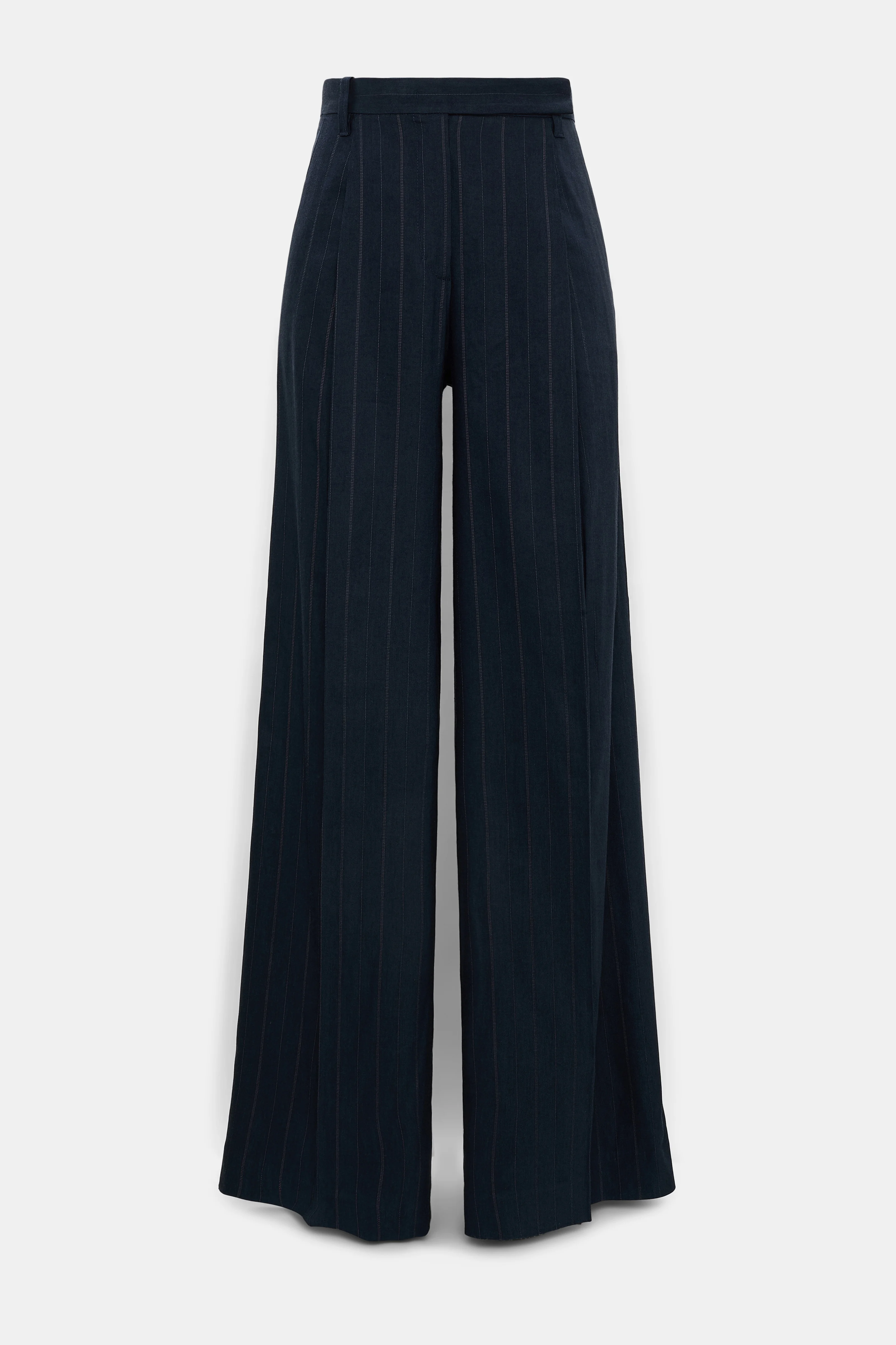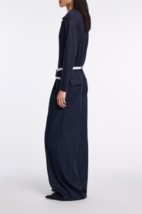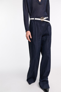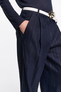 The new suiting is (pin)striped: Crafted in a linen blend, the pinstripe pants feature front pleats and a wide leg. The pants can be worn as part of a suit with the matching shell and blazer. Material & Care - 52 % Linen, 45 % Viscose, 2 % Elastane, 1 % Polyester - Wide pleated pinstripe pants - Waistband with extended tab closure - Diagonal side pockets - Back flap pockets - Comes with an unfinished hemline so you can custom tailor to your desired length - Dry clean only - No optical brighteners - Do not expose to extreme light - Shield from sharp items Size & Fit - Our model is 180cm tall and wears a size 2 - Wide leg