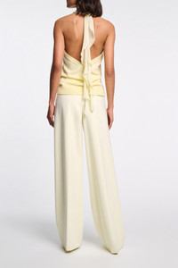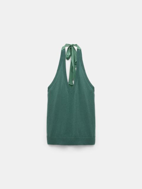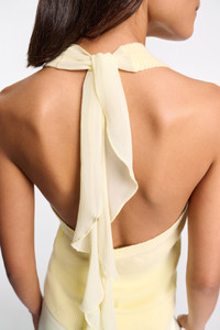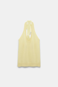 The halter top is knit in a Merino-cashmere blend and has a V-neckline in the front and back. The top has a tonal silk georgette flounce tie. Material & Care - 67 % Virgin wool (Merino), 28 % Cashmere, 4 % Polyamide, 1 % Elastane - 100 % Silk - Merino-cashmere blend halter-neck tank top - V-neckline in the front and back - Silk georgette flounce tie - WE CARE - The yarn is mulesing-free - WE CARE - This item is finished according to STANDARD 100 by OEKO-TEX, 22.0.98928 Hohenstein HTTI Size & Fit - Our model is 178 cm tall and wears a size S - Fitted
