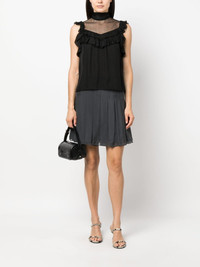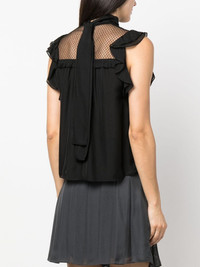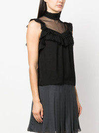 panelled sleeveless silk chiffon blouse Highlights - Black - Silk - Chiffon - Ruffled detailing - Sheer panelling - Sleeveless - High neck - Flared hem Imported Composition Silk 100% SIZE & FIT Model measurements Height 5 ft 11 in(1.8 m) Bust/Chest 33.07 in(84 cm) Hips 37.4 in(95 cm) Waist 25.19 in(64 cm)