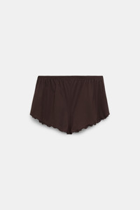 The lingerie shorts are made from technical jersey and have natural ruffle trim. The shorts can be worn as a set with the matching camisole. Material & Care - 73 % Polyamide, 27 % Elastane - Technical jersey lingerie shorts - Baby overlock edge finishing - Elastic waistband with zigzag stitching - WE CARE - This item is finished according to OEKO-TEX® STANDARD 100, 22.0.98928 Hohenstein - Hand wash cold / Machine wash old - Wash with similar colors Size & Fit - Our model is 179cm tall and wears a size 2 - Elastic waist - Loosely fitted leg