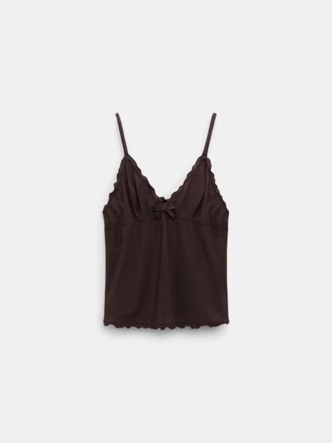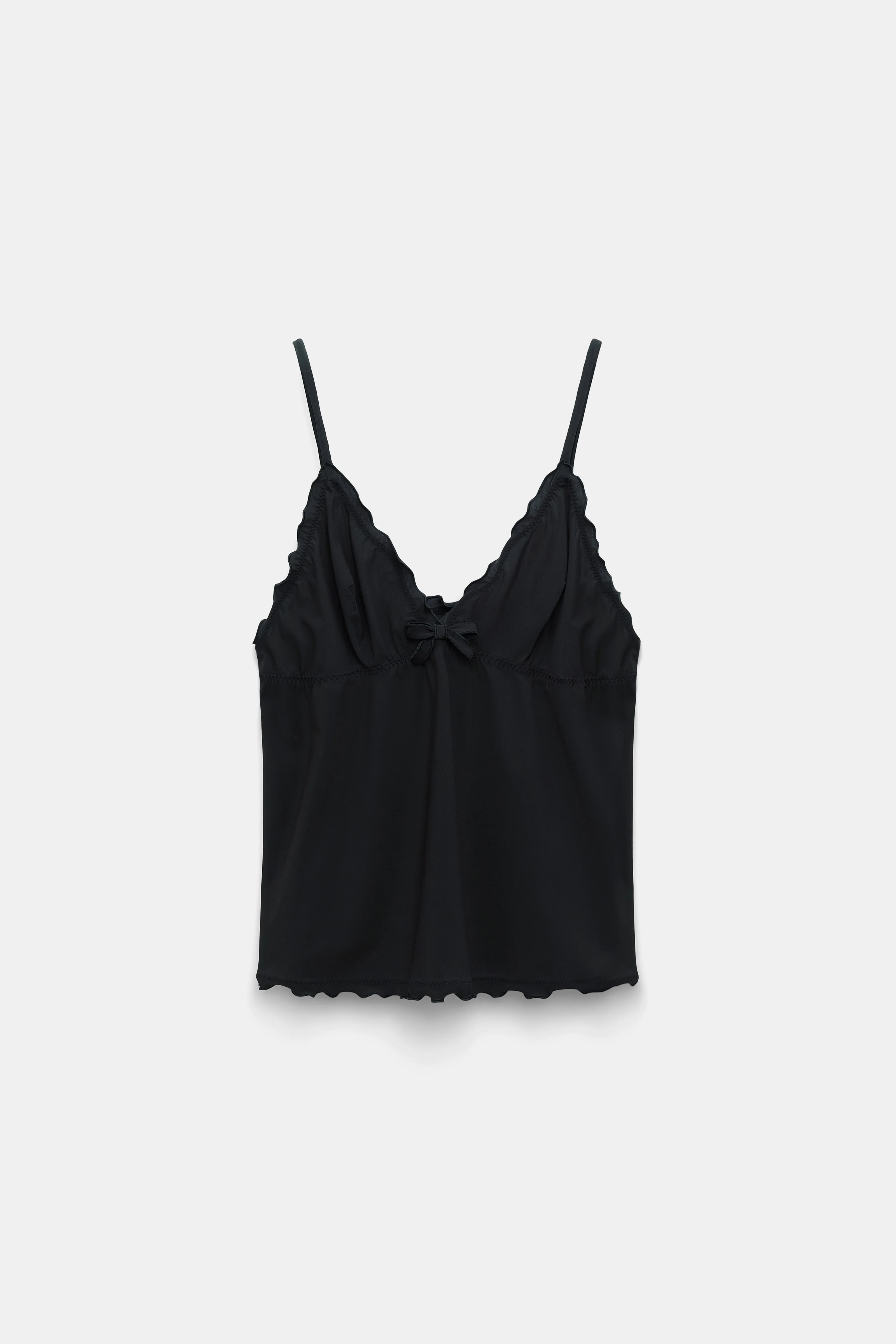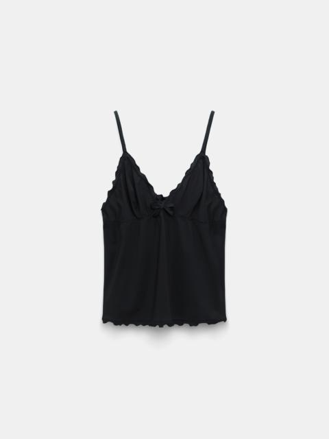 The camisole is made from technical jersey and has natural ruffle trim. The cami can be worn as a set with the matching shorts. Material & Care - 73 % Polyamide, 27 % Elastane - Technical jersey camisole - Baby overlock edge finishing - Small bow at the center front - Adjustable straps - Hand wash cold / Machine wash old - Wash with similar colors Size & Fit - Our model is 180cm tall and wears a size 2 - Form-fitting - Slight flared hem