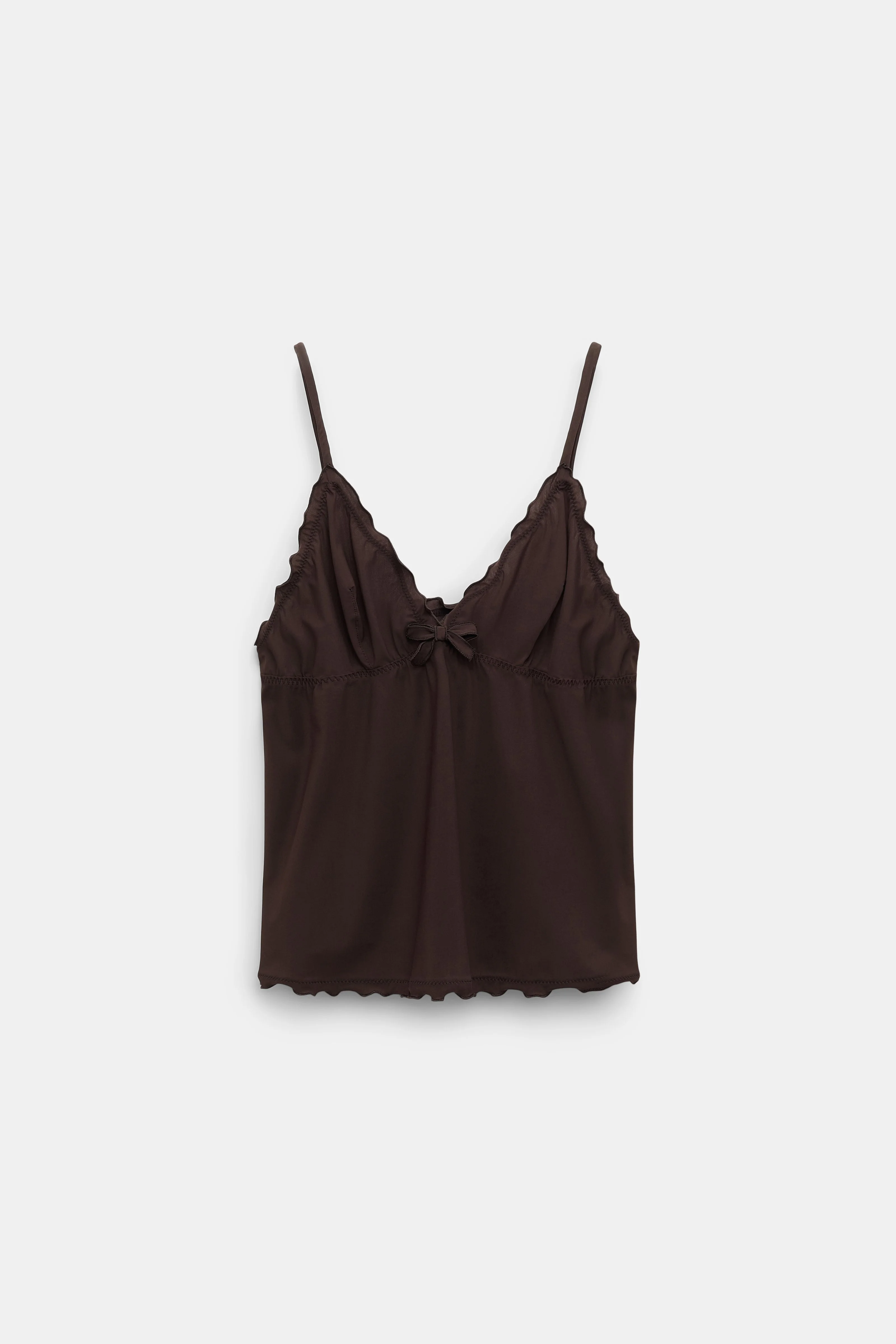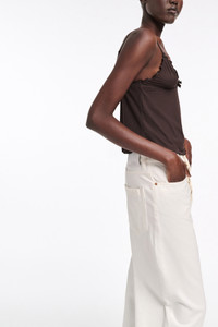 The camisole is made from technical jersey and has natural ruffle trim. The cami can be worn as a set with the matching shorts. Material & Care - 73 % Polyamide, 27 % Elastane - Technical jersey camisole - Baby overlock edge finishing - Small bow at the center front - Adjustable straps - Hand wash cold / Machine wash old - Wash with similar colors Size & Fit - Our model is 180cm tall and wears a size 2 - Form-fitting - Slight flared hem