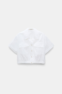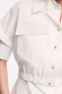 The cotton poplin blouse features an open collar and flap pockets. The cropped style has an elastic waist and D-rose deatiling on the buttons. For a layered look, pair with the cotton poplin midi-dress. Material & Care - 96 % Cotton, 4 % Elastane - Cropped, short sleeve blouse in cotton poplin - Elastic hem - Petite notched collar - Flap pockets - Buttons with D-rose detail - WE CARE - This item is finished according to STANDARD 100 by OEKO-TEX, 22.0.98928 Hohenstein HTTI - Hand wash program / Machine wash - Wash with similar colors Size & Fit - Our model is 180cm tall and wears a size 2 - Boxy - Cropped - Slight dropped shoulders