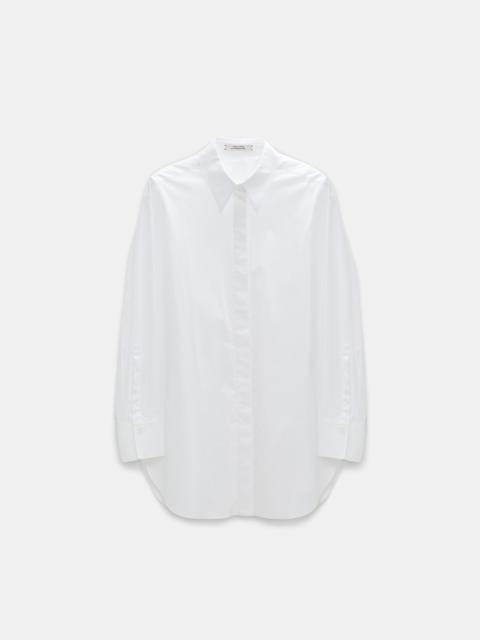 With a longer length and causal cut, the blouse is made of stretch cotton poplin and features classic styling like a concealed button placket and rounded hem. Slits at the cuffs maximize styling versatility with buttons. Material & Care - 97 % Cotton, 3 % Elastane - Long, relaxed cut shirt in stretch cotton poplin - Concealed button placket - Buttoned cuffs - Rounded shirt hem - Kellerfalte hinten Size & Fit - Our model is 177cm tall and wears a size S - Relaxed fit - Dropped shoulders - Longer length