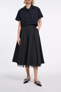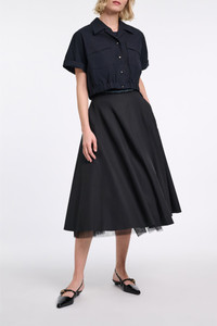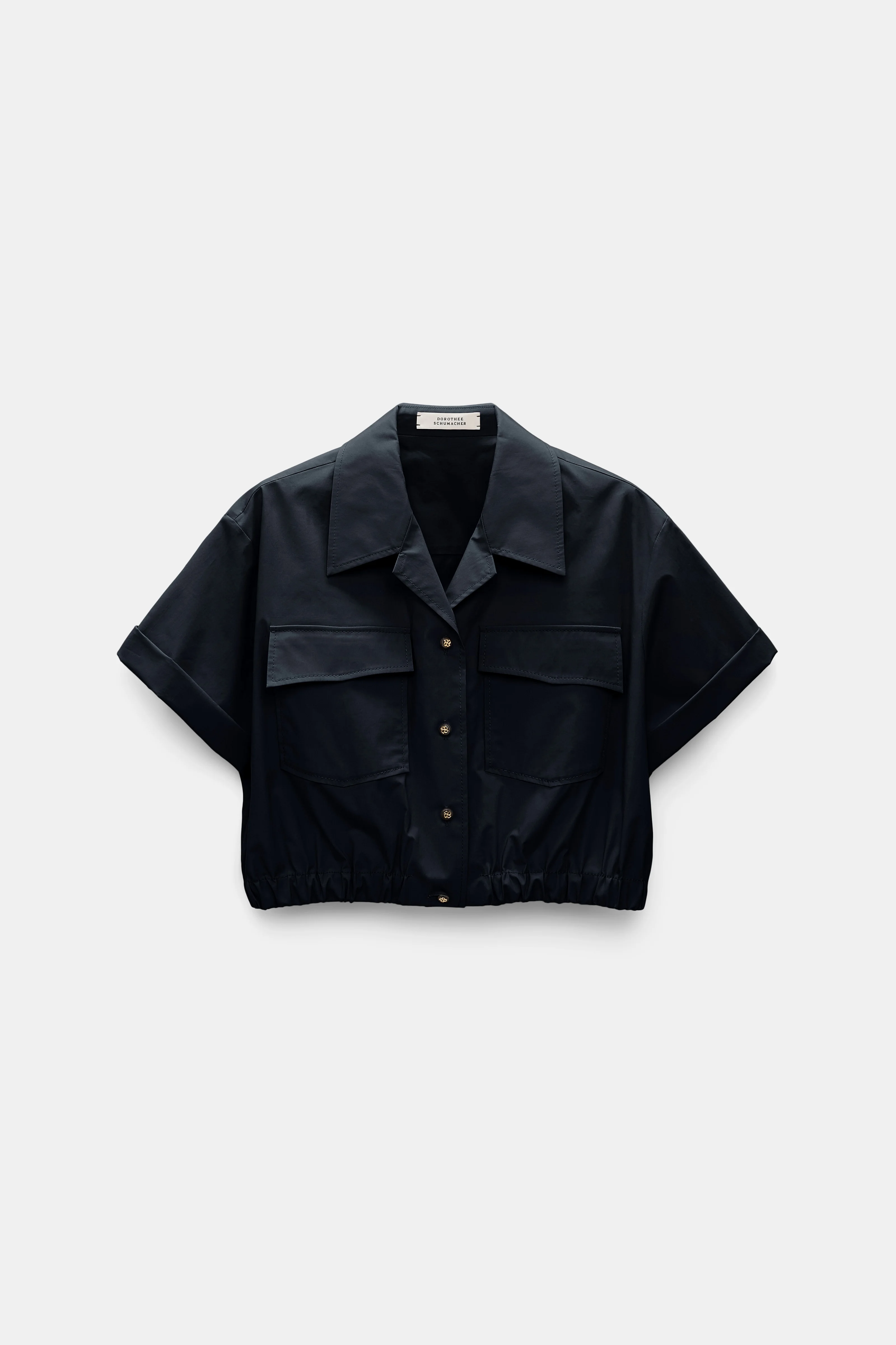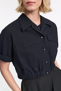 The cotton poplin blouse features an open collar and flap pockets. The cropped style has an elastic waist and D-rose deatiling on the buttons. For a layered look, pair with the cotton poplin midi-dress. Material & Care - 96 % Cotton, 4 % Elastane - Cropped, short sleeve blouse in cotton poplin - Elastic hem - Petite notched collar - Flap pockets - Buttons with D-rose detail - WE CARE - This item is finished according to STANDARD 100 by OEKO-TEX, 22.0.98928 Hohenstein HTTI - Hand wash program / Machine wash - Wash with similar colors Size & Fit - Our model is 180cm tall and wears a size 2 - Boxy - Cropped - Slight dropped shoulders